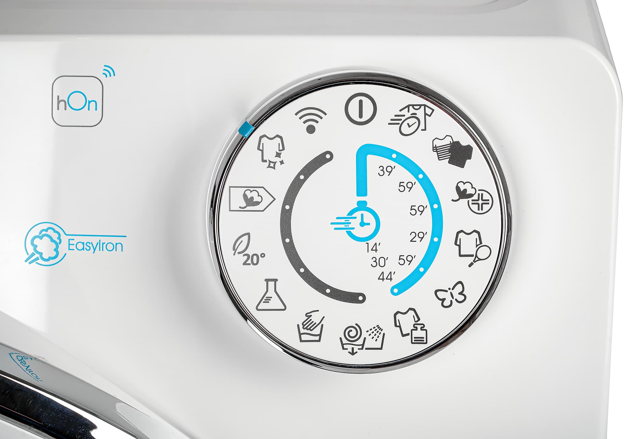 Положение селектора обозначается голубой пластиковой меткой на ребре. Ее нижнее положение приходится на «слив/отжим», а верхнее — на «выкл.». При включении машины поворотом селектора в левую сторону первой позицией является режим управления с мобильного телефона, а на первом месте справа — режим быстрой ежедневной стирки, что вполне логично.