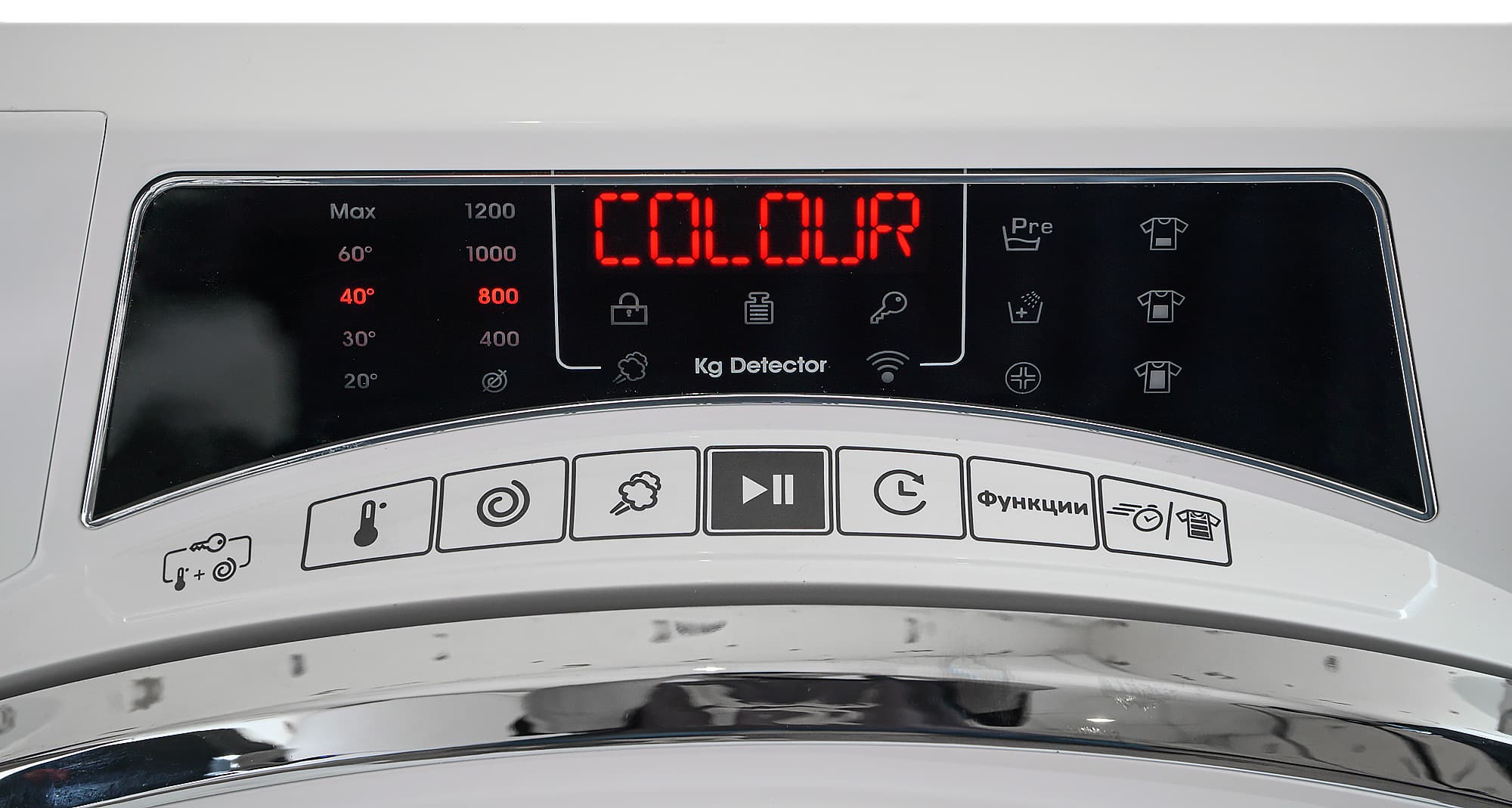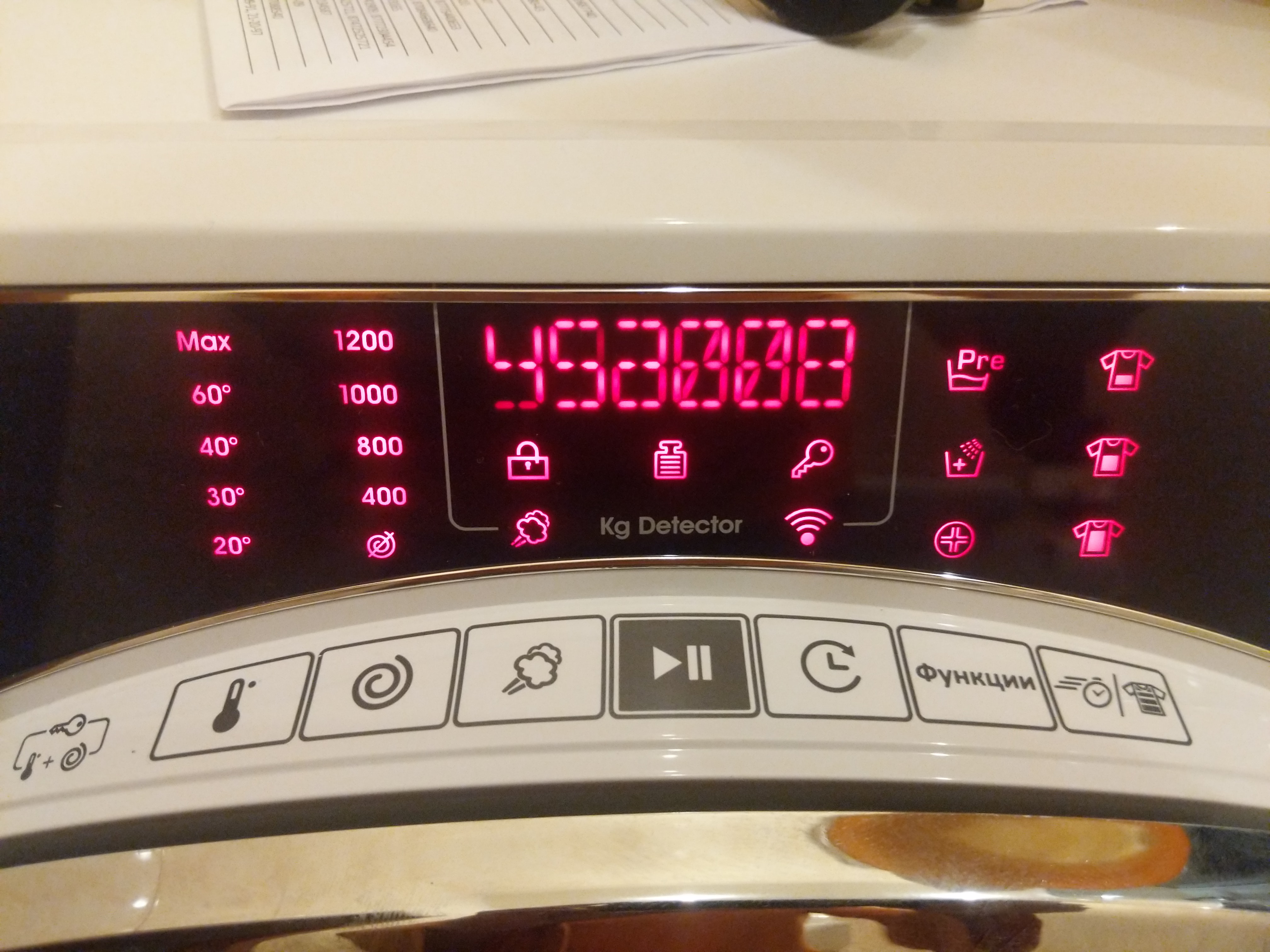 Под символьным дисплеем располагаются индикаторы блокировки барабана, функции защиты от детей, режима обработки паром и активности беспроводного интерфейса. Значок «Kg Detector» зажигается при стирке во время работы функции определения загрузки.