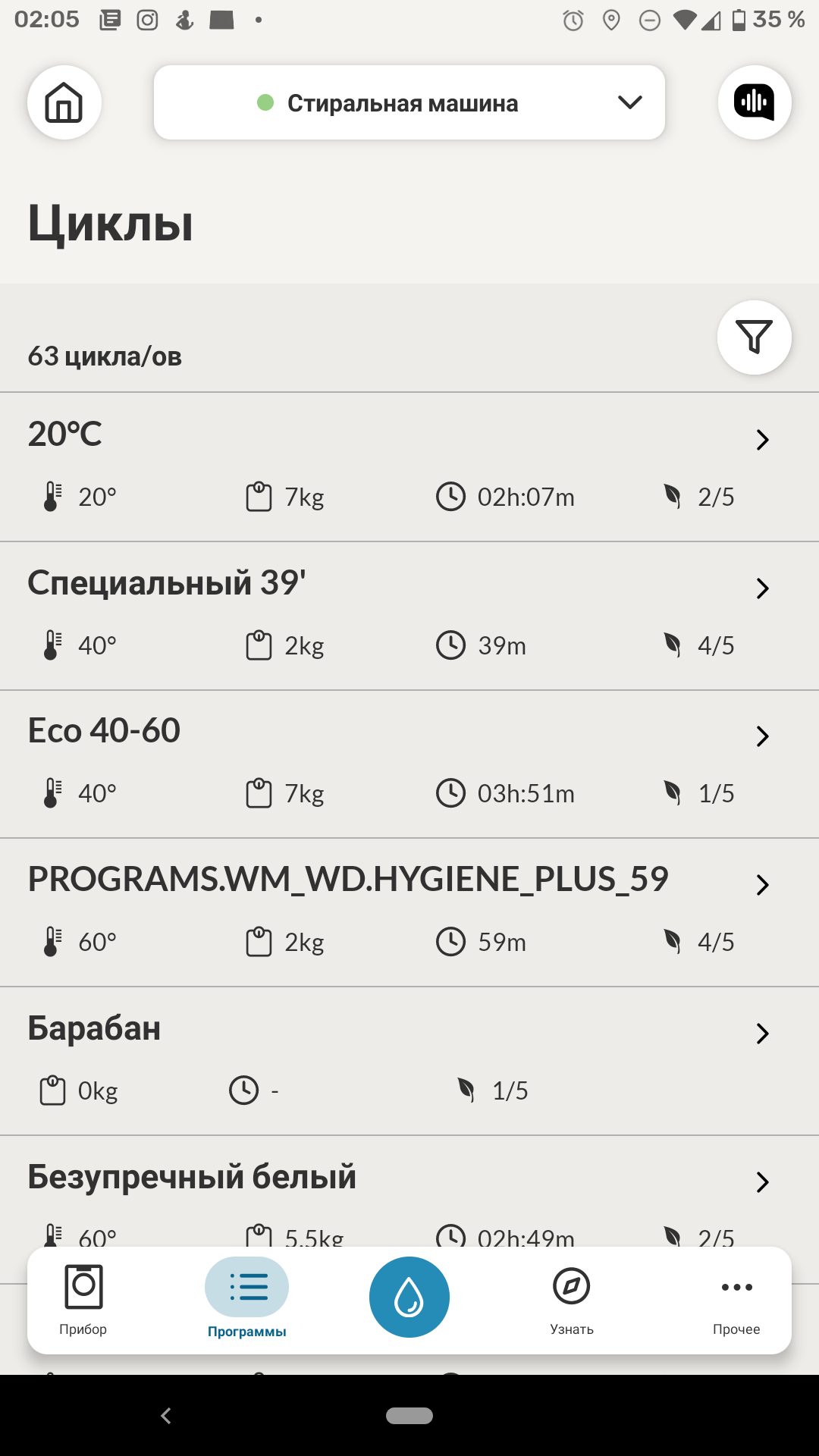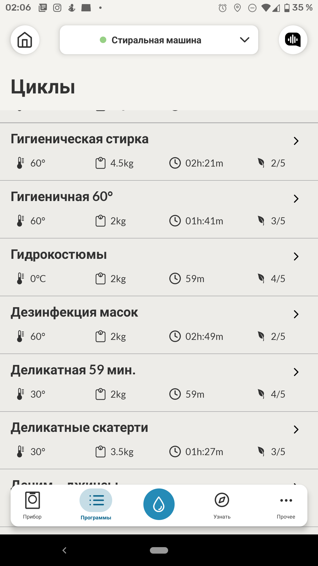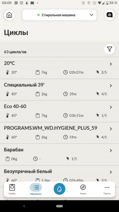 Приложение hOn впечатляет списком предустановленных программ стирки — их целых 65, на все случаи жизни. Это разнообразные режимы стирки всевозможной одежды — повседневной, спортивной, верхней и деликатной, программы удаления пятен от различных продуктов, чистки одеял и многого другого. Включены в список и актуальные для эпидемии коронавируса программы обработки медицинских масок: отдельная для стирки и отдельная — для освежения.