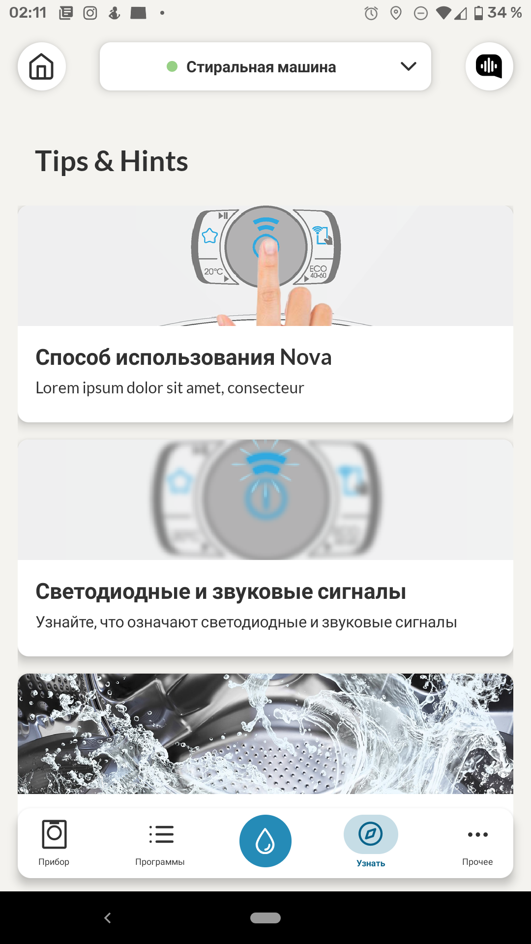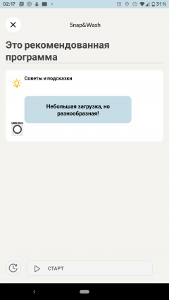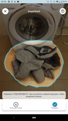 У приложения есть забавная функция: оно предлагает свалить кучу одежды перед машиной, сфотографировать ее и обещает дать рекомендации по стирке после анализа фотографии. Однако, что бы мы ни складывали на полу, рекомендацию получали одну: «Небольшая загрузка, но разнообразная!». Что ж, для свежевыпущенного приложения это простительно.