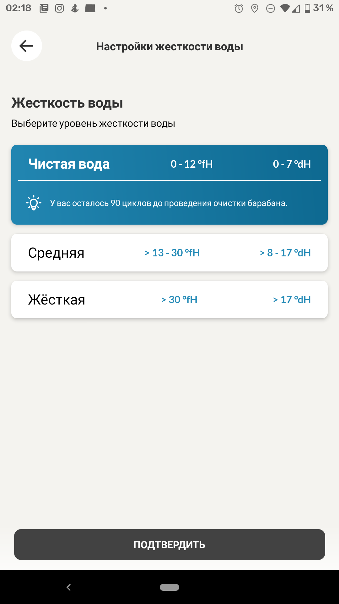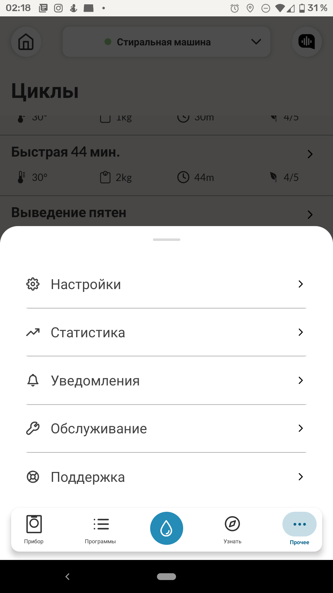 В разделе настроек можно установить уровень жесткости воды, провести обслуживание и самодиагностику стиральной машины, а также управлять уведомлениями и кое-какими сервисными функциями приложения.