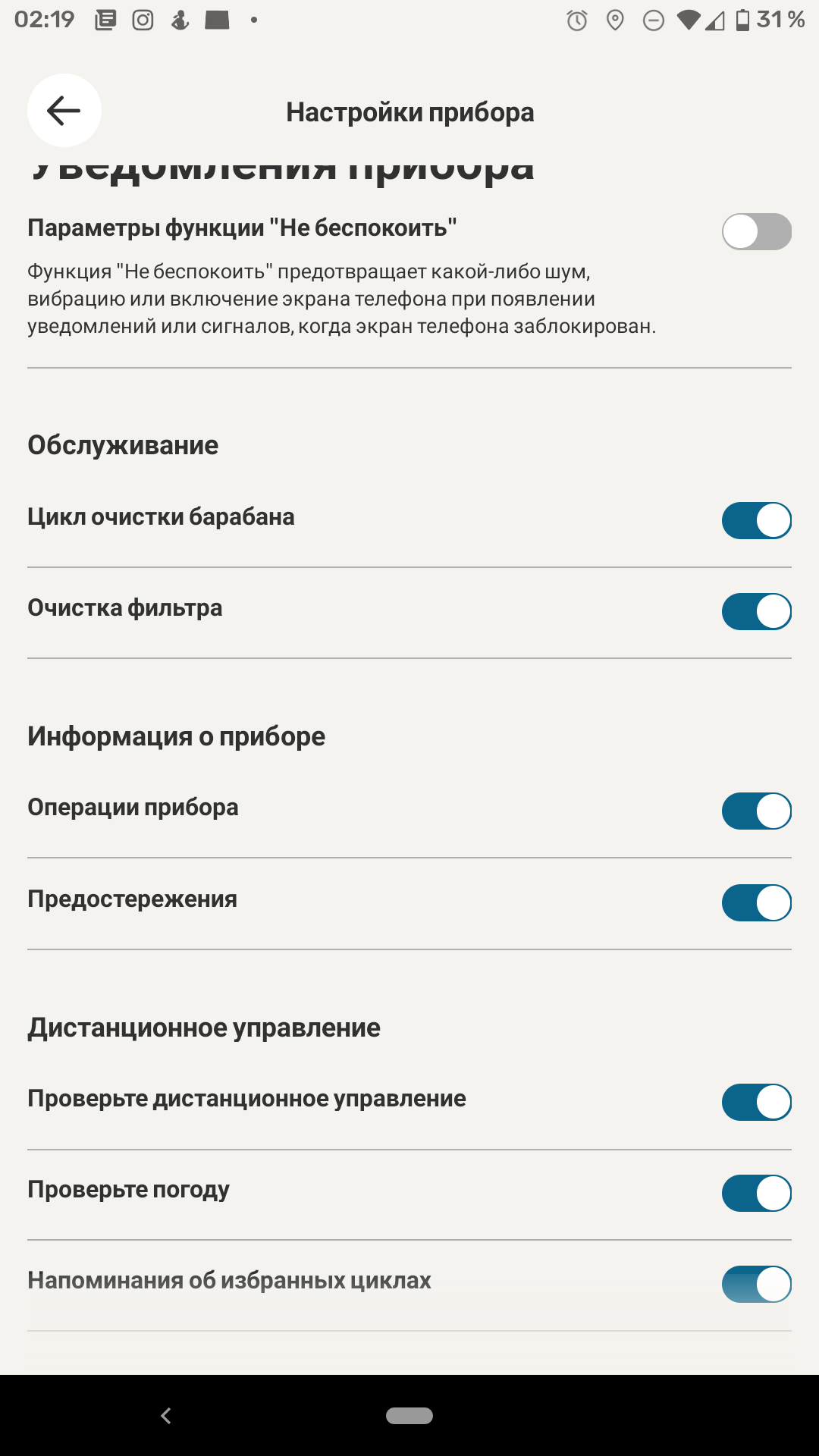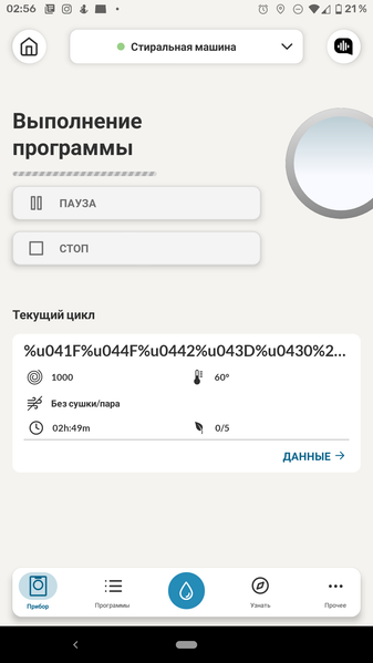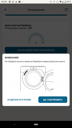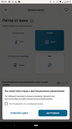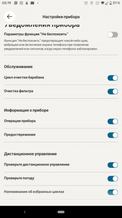 Приложение позволяет контролировать ход выполнения программы, а по завершении присылает на мобильное устройство push-уведомление. Оно придет на смартфон, даже если владелец покинул дом и ушел по делам, — для этого стиральной машине и нужен доступ в интернет. Уведомления, разумеется, можно отключить в настройках.
