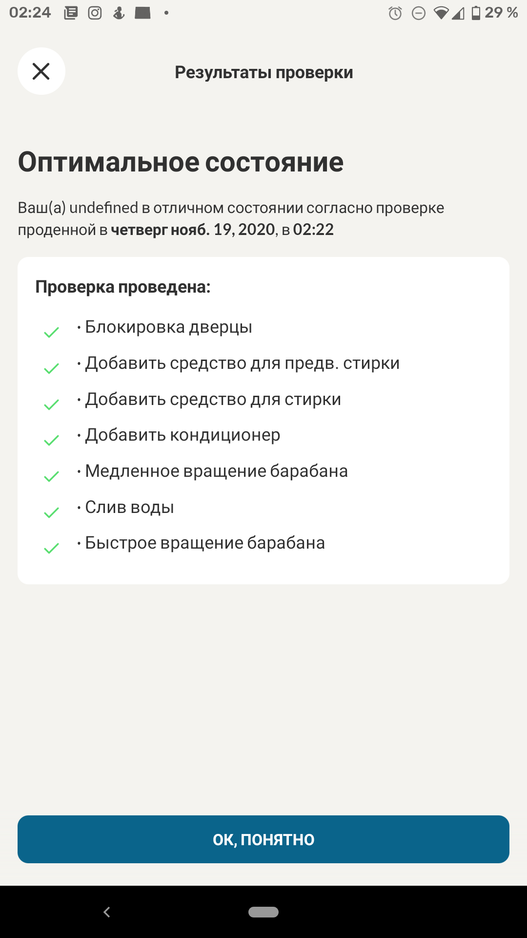 Между окончанием финального отжима и разблокировкой барабана машина берет заметную паузу: около 2 минут с момента остановки вращения и выключения помпы. Сигнал об окончании цикла, разблокировка и отправка push-уведомления на мобильный телефон происходят практически одновременно.