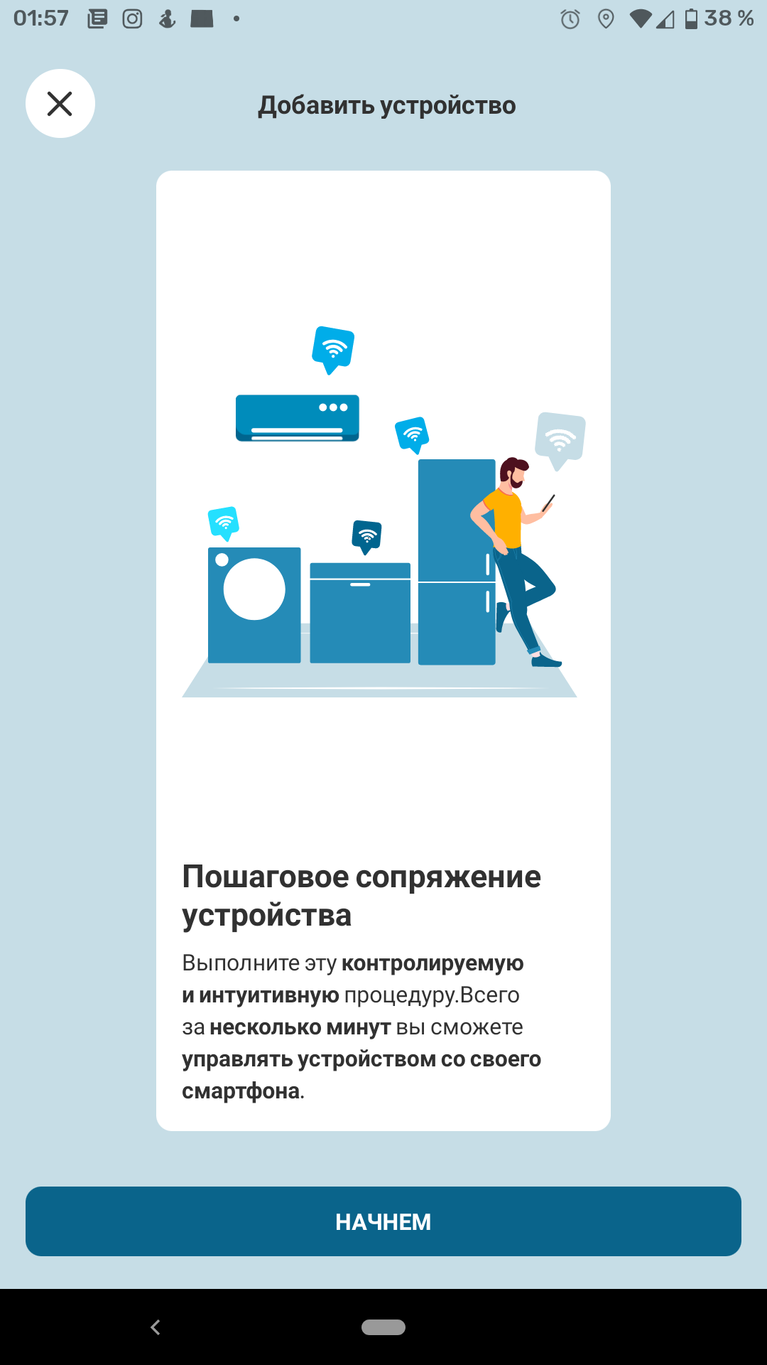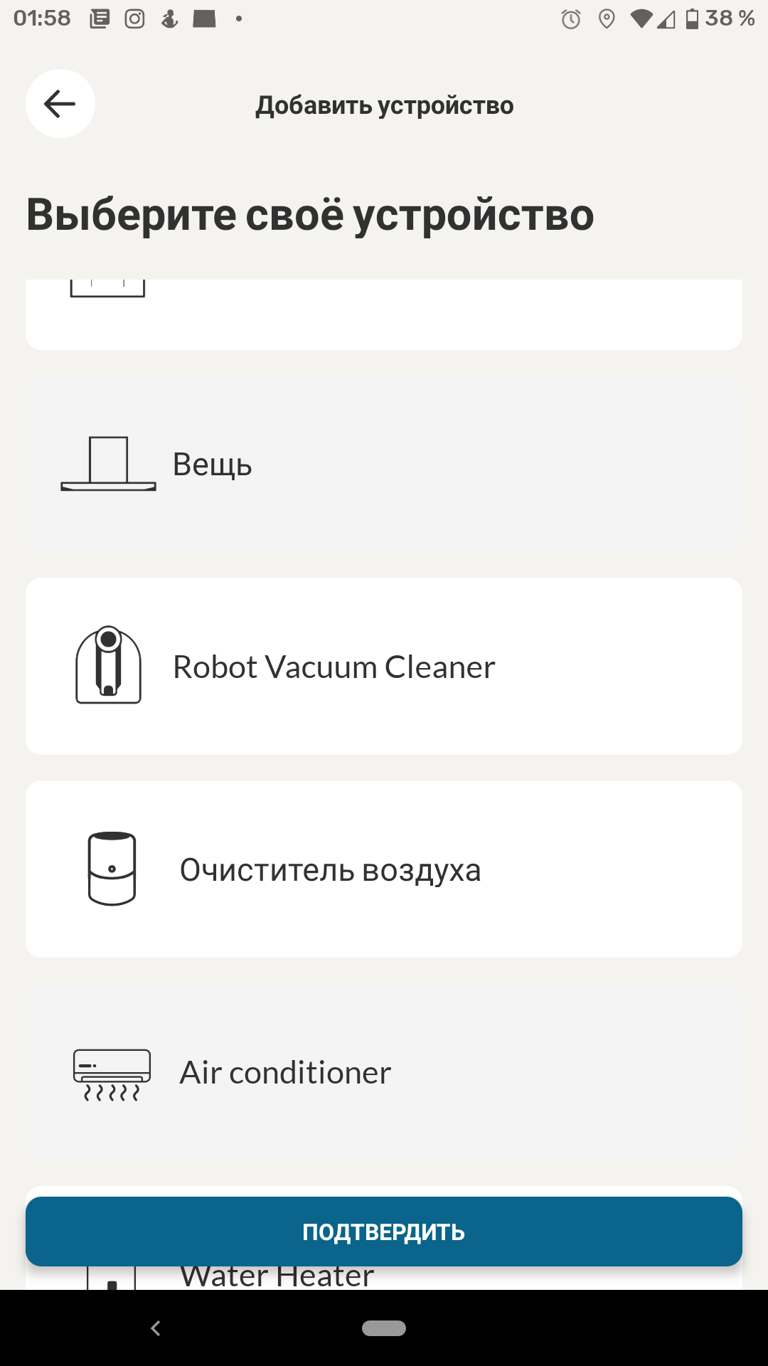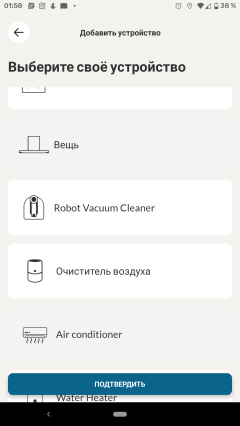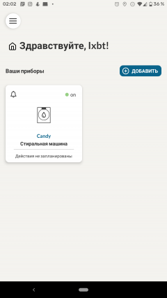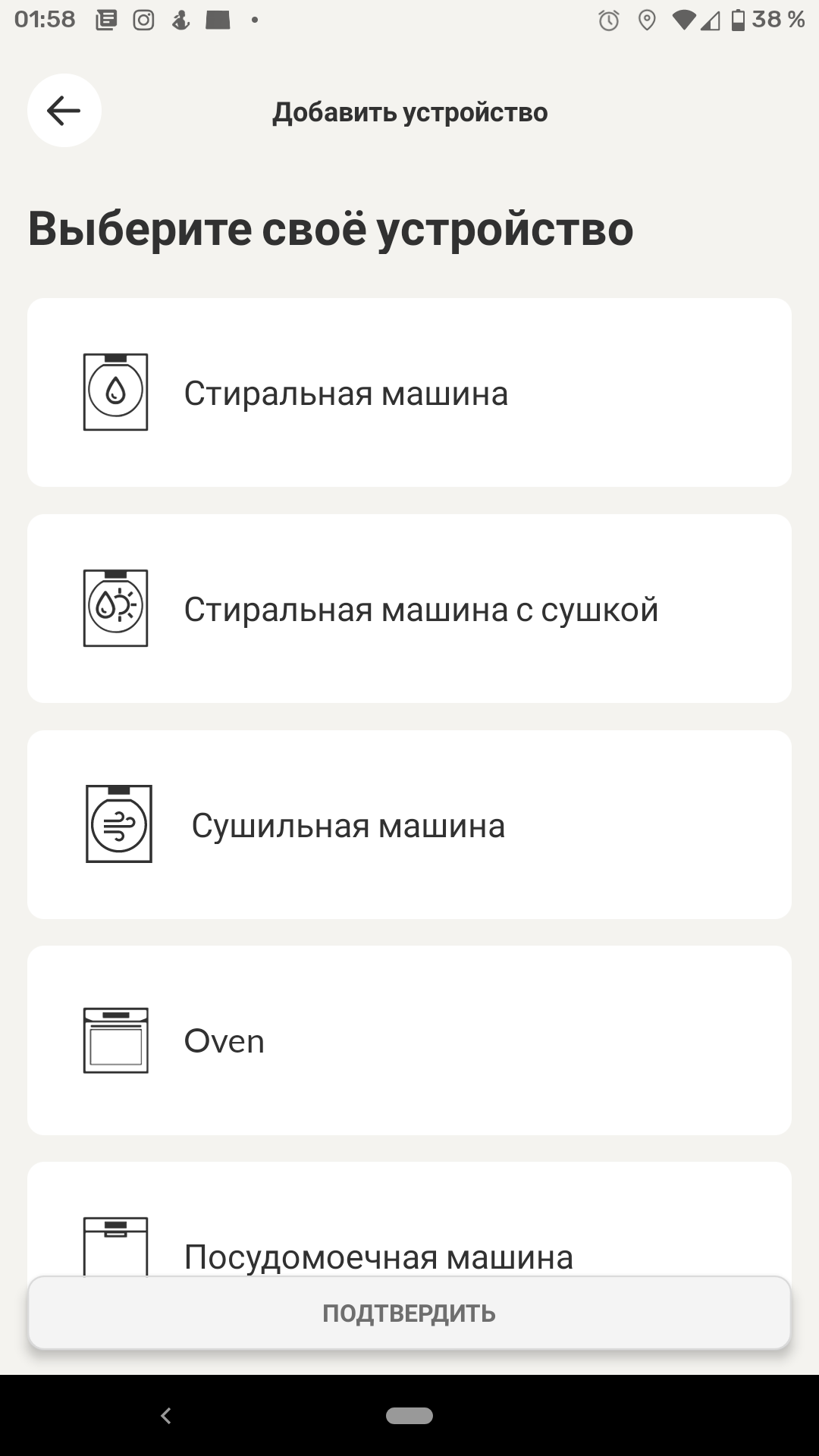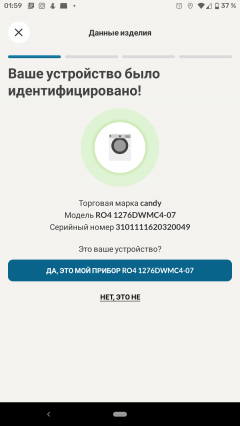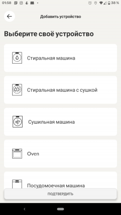 Регистрация нового аккаунта не сопровождалась какими-либо сложностями. После нее можно добавить в приложение наше устройство. Из довольно длинного и не целиком русифицированного списка мы выбираем пункт «Стиральная машина».