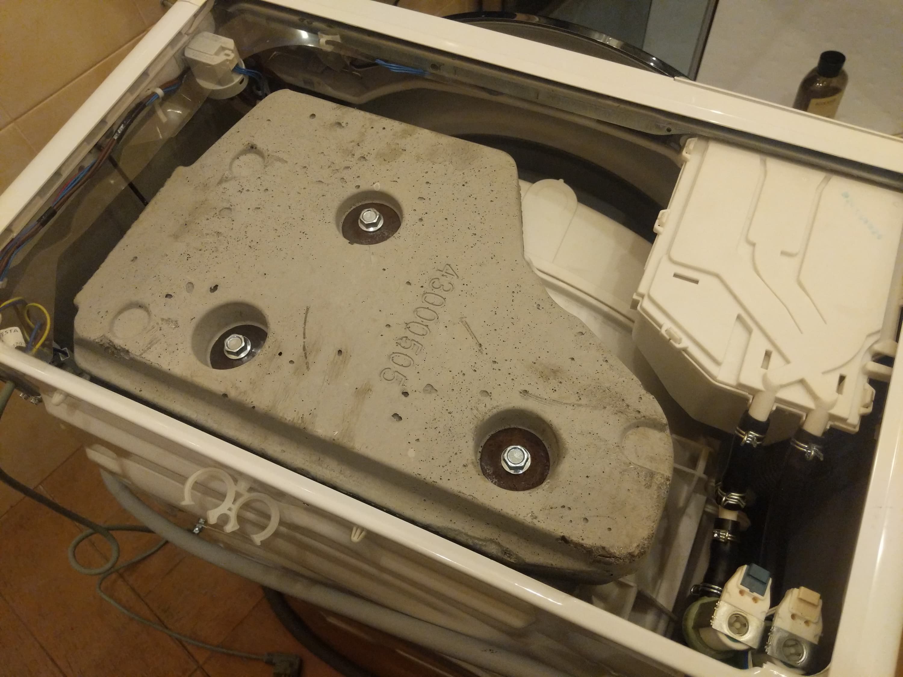 Перед началом работы необходимо удалить четыре транспортировочных винта, удерживающих барабан, и вынуть винты, резиновые пробки и пластиковые втулки. Если втулки при этом падают внутрь устройства — не страшно. Для их извлечения достаточно чуть наклонить корпус машины — и они выпадут на пол.