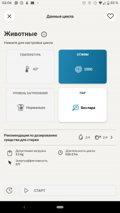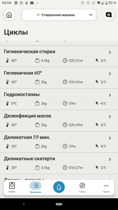Настройки предустановленных программ логичны, и мы не нашли ни одного сценария с неподходящими режимами стирки: температура, скорость отжима, рекомендованные вес белья и расход моющих средств выглядят вполне здраво.