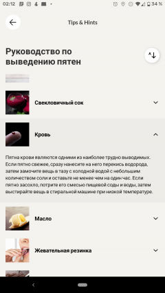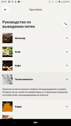 В разделе справки можно найти рекомендации по использованию прибора, а также советы по удалению пятен от множества веществ. Текстовое наполнение справочного раздела неполно, мы несколько раз натыкались на классическую «рыбу» — Lorem ipsum.