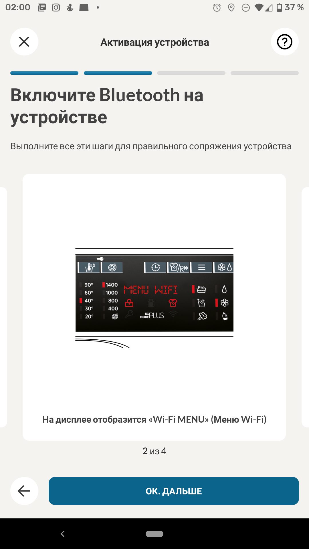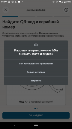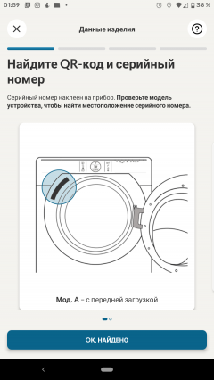 Для синхронизации машины необходимо просканировать QR-код, расположенный на наклейке с серийным номером под люком барабана. Приложение подсказывает, где его искать, и запрашивает разрешение на доступ к камере.