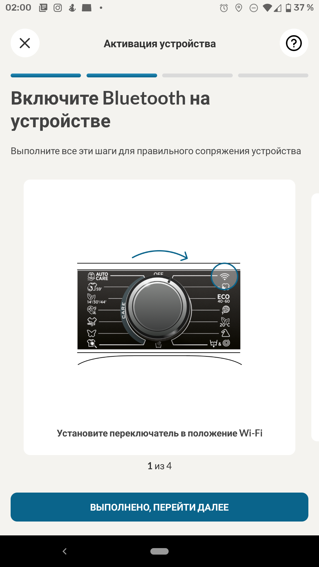 Эта модель отправляет уведомления об окончании работы любого цикла — как запущенного с помощью приложения, так и включенного вручную, с помощью селектора и кнопок. Сетевые функции работают вне зависимости от положения селектора. А вот запустить стирку через приложение можно только при селекторе, установленном в позицию «Wi-Fi».