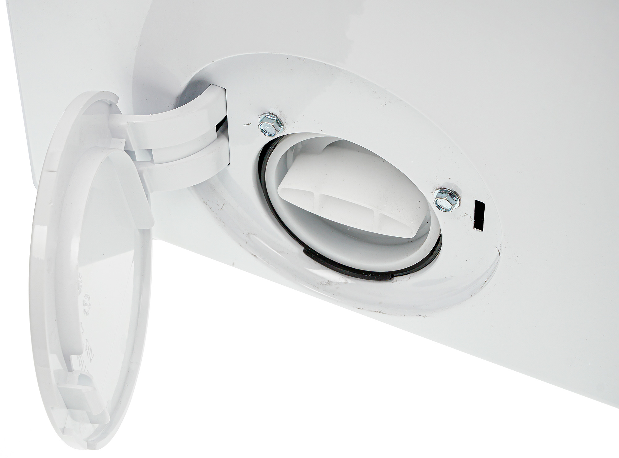 В нижней части передней панели под круглой крышкой располагается пробка выпускного фильтра. И крышка, и пробка открываются легко и без затруднений.