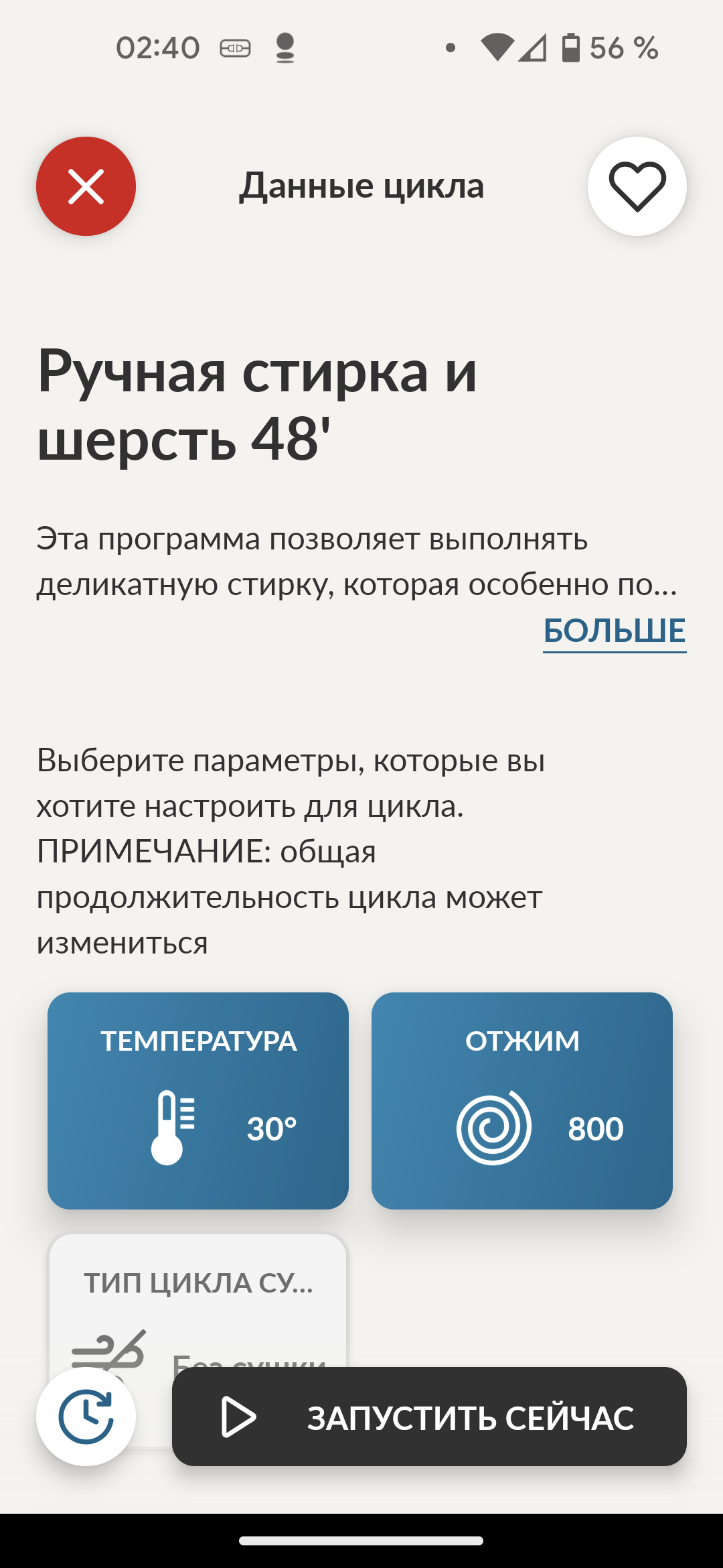 | Шерсть/Ручная | 30 | 0:30 | 0:49 | 800 | 0—800 |