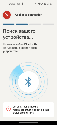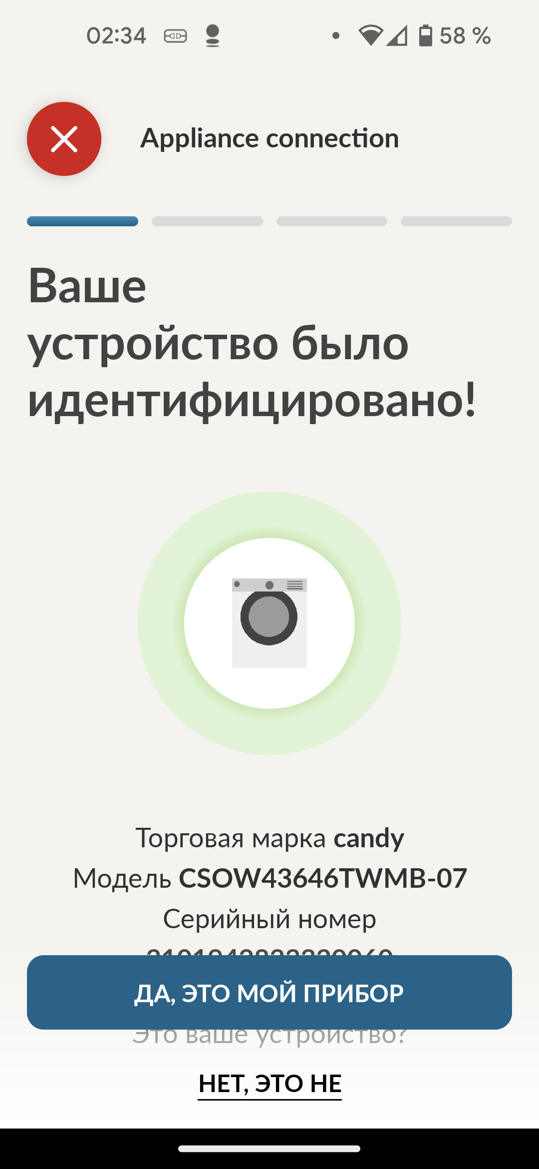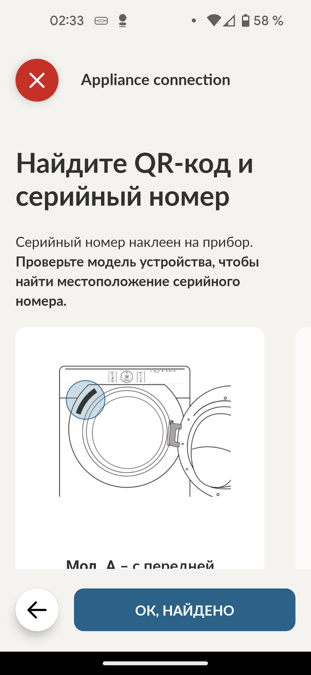 Для синхронизации машины необходимо просканировать QR-код, расположенный на наклейке с серийным номером под люком барабана. Приложение подсказывает, где его искать, и запрашивает разрешение на доступ к камере.