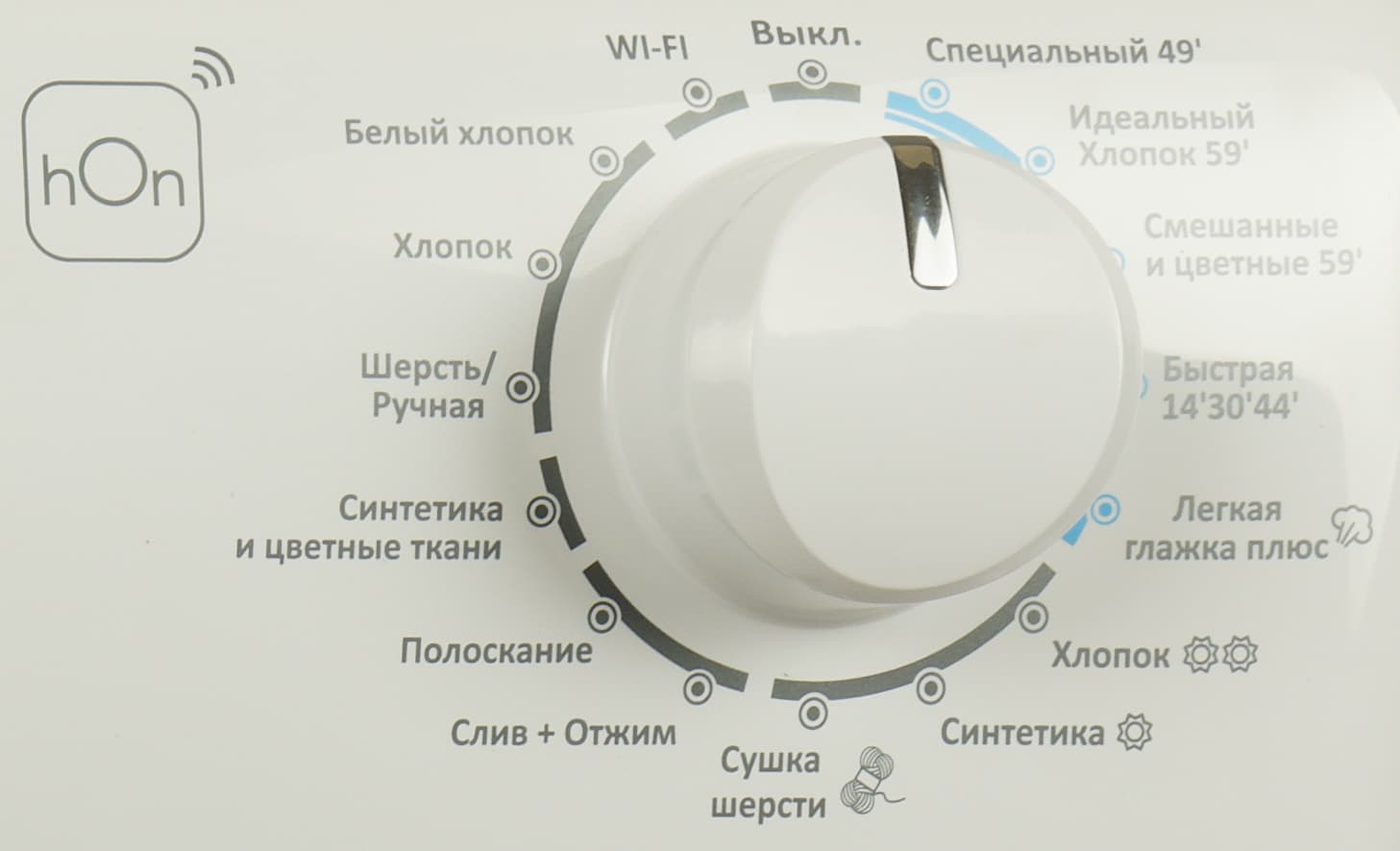 Верхнее положение метки селектора выключает машину. Рядом с ним слева — режим управления с помощью мобильного приложения, а справа — фирменные программы, выделенные голубым цветом: три коротких (по 59 минут) сценария для различных типов ткани, супербыстрая стирка для слабозагрязненных вещей и цикл «Легкая глажка плюс», предназначенный для освежения с помощью пара очень сухой и слежавшейся одежды.