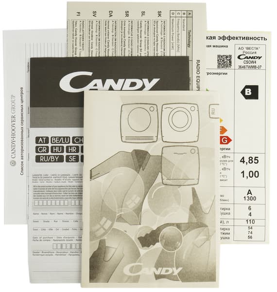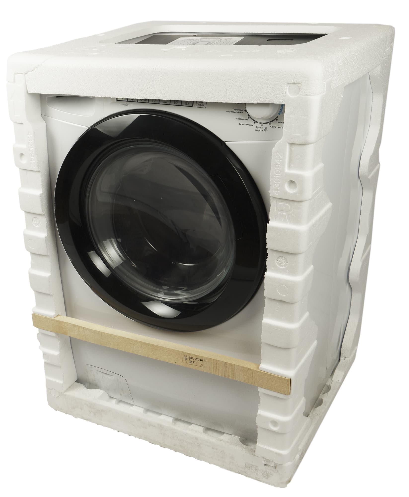 Небольшая наклейка на полиэтилене сверху содержит серийный номер, индекс модели, транспортировочную и технологическую информацию. В комплект стиральной машины входят: