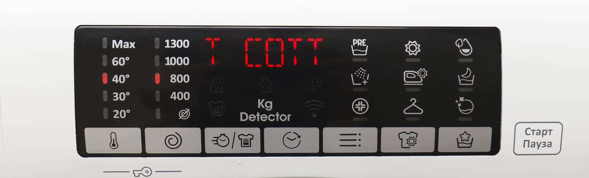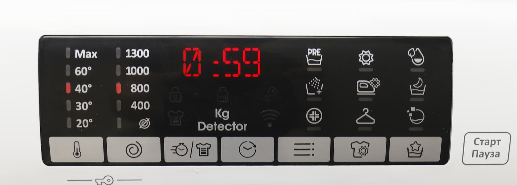 В центре дисплея отображается время стирки: ожидаемое или оставшееся до конца программы. Под цифрами расположены индикаторы блокировки барабана, защиты от детей, активных функций «Kg Detector» и «Легкая глажка», а также работы беспроводного сетевого интерфейса.