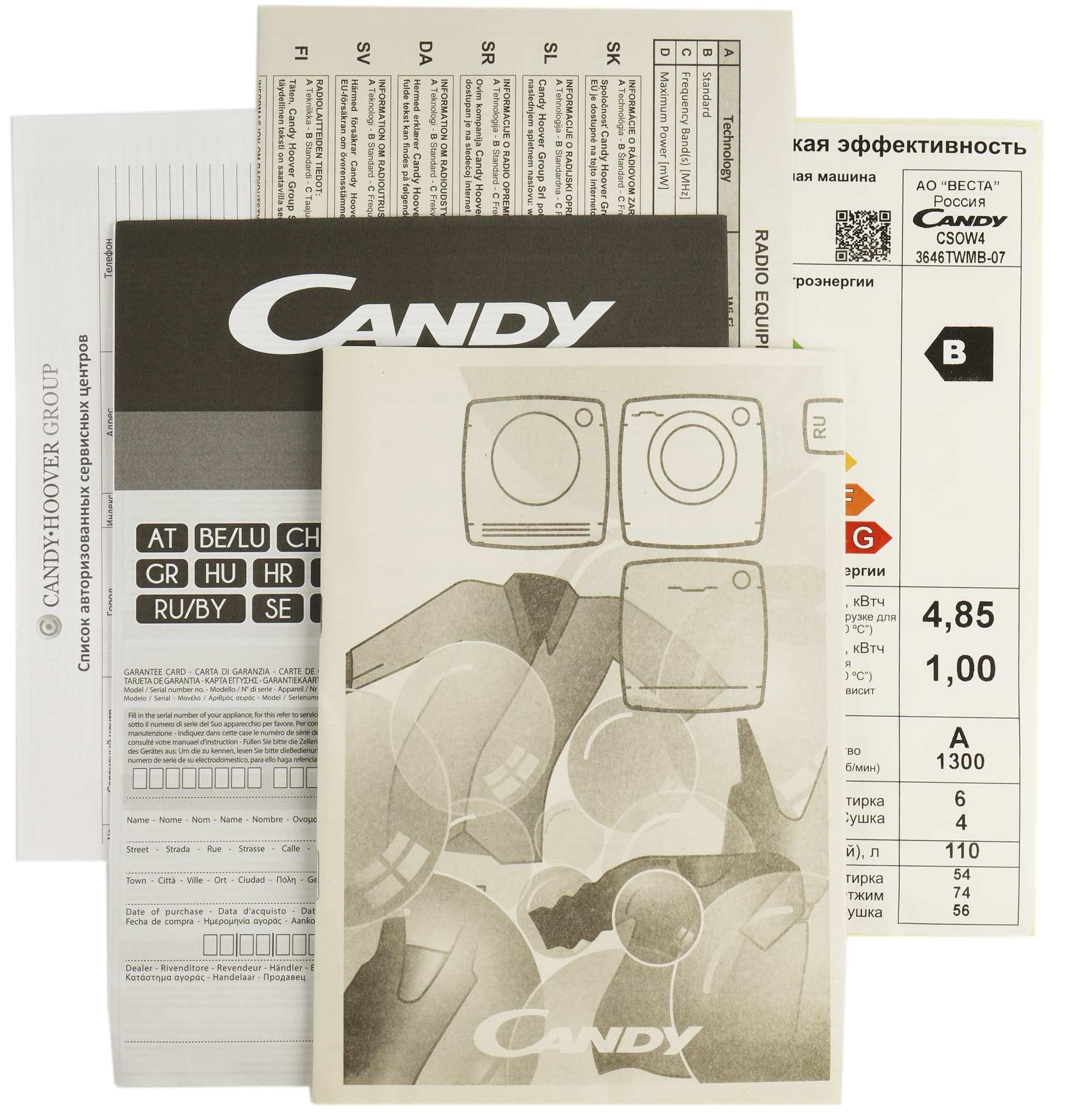 Стирально-сушильная машина Candy Smart Pro Inverter CSOW43646TWMB-07 поставляется в технологической упаковке из пенопласта, усиленной деревянным бруском с лицевой стороны и обтянутой толстым полиэтиленом.