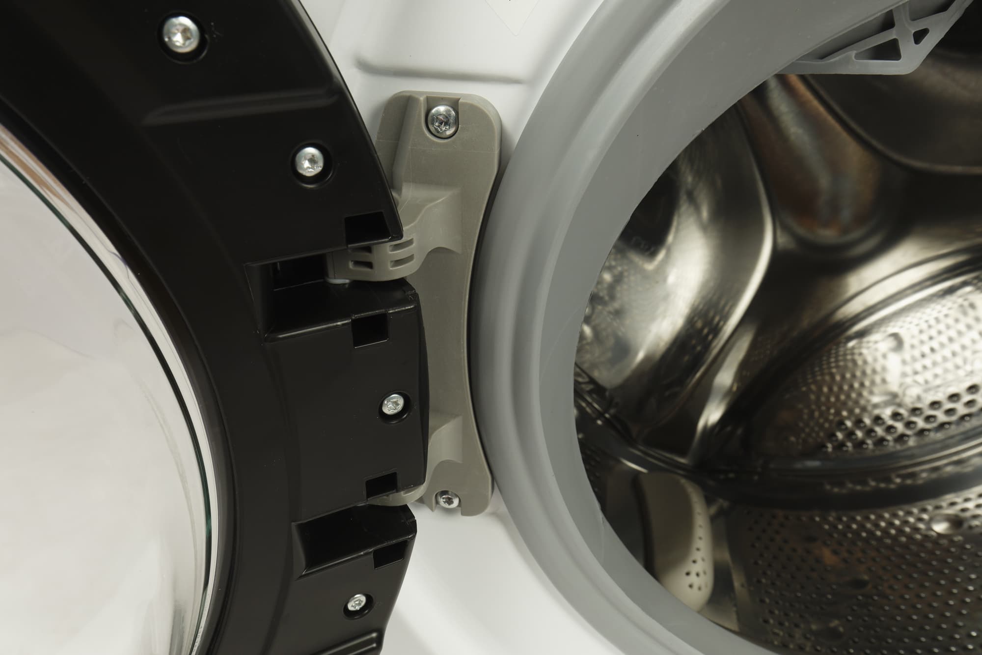 Крышка барабана окантована декоративной полоской черного глянцевого пластика. Люк двухслойный: прозрачная пластмасса снаружи и стекло изнутри.