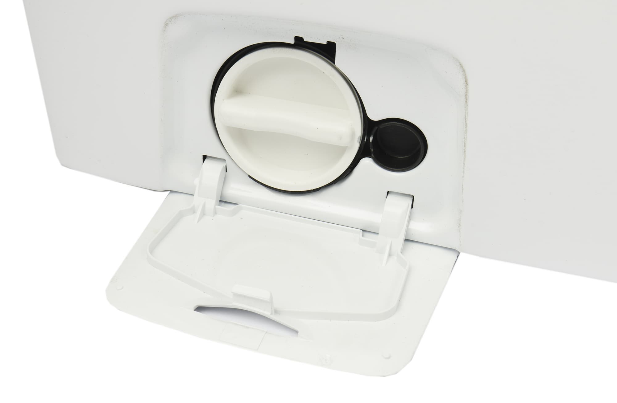 В правом нижнем углу передней панели — откидывающийся лючок, под которым скрывается пробка выпускного фильтра.