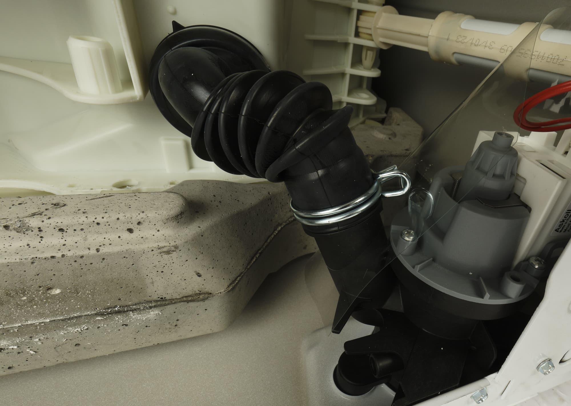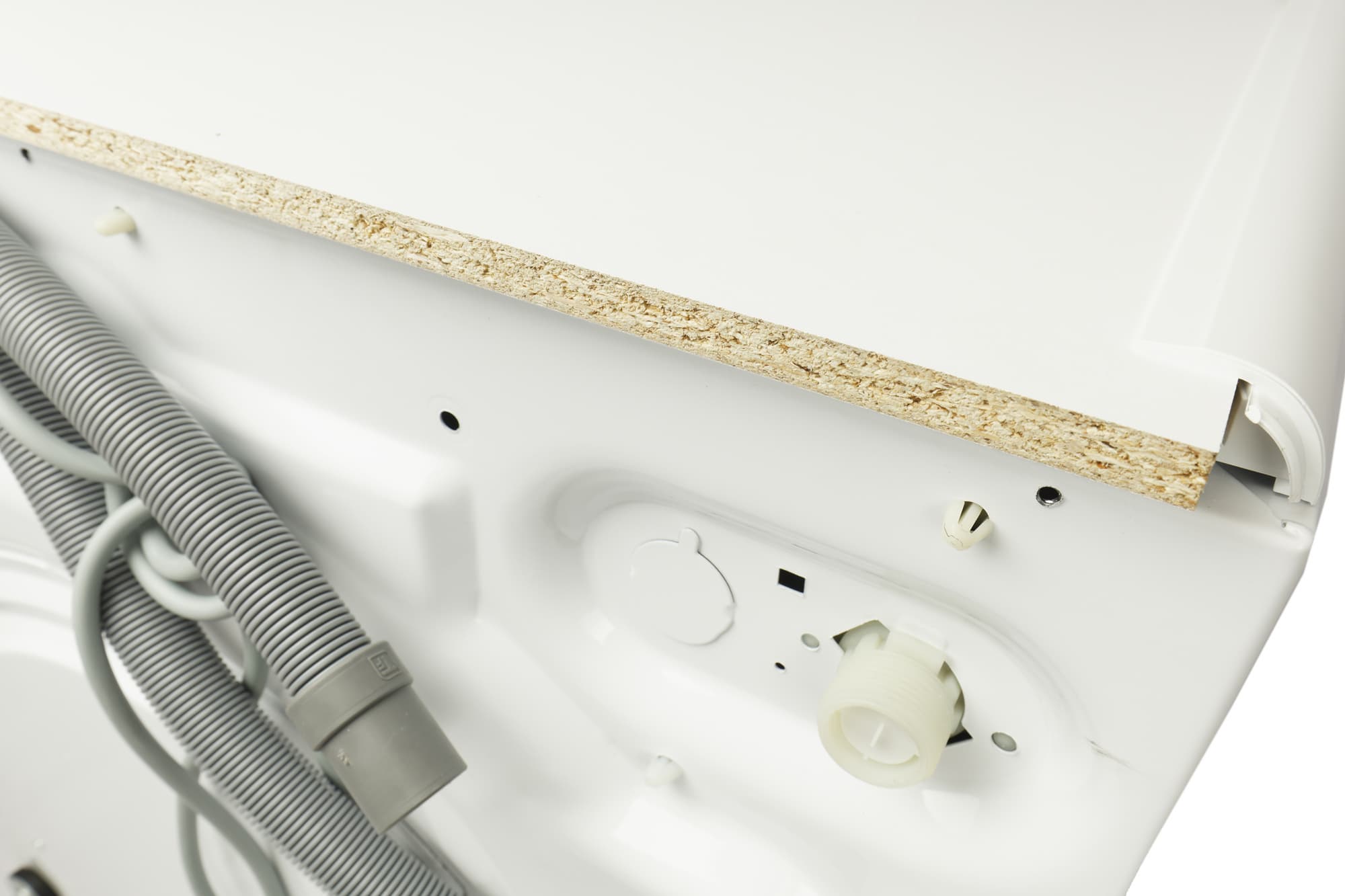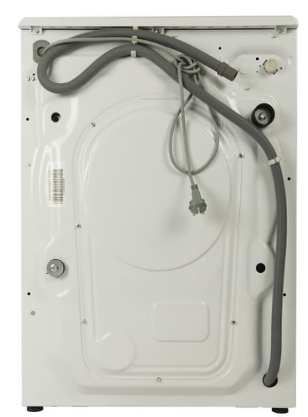 Сливной шланг уже установлен и закреплен в специальных держателях на задней панели. В левом верхнем углу расположена розетка для заливного шланга, снабженная сетчатым фильтром от ржавчины. Эта модель, как и большинство стиралок, рассчитана на подключение только к холодному водоснабжению.