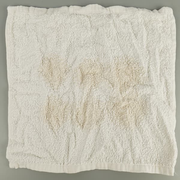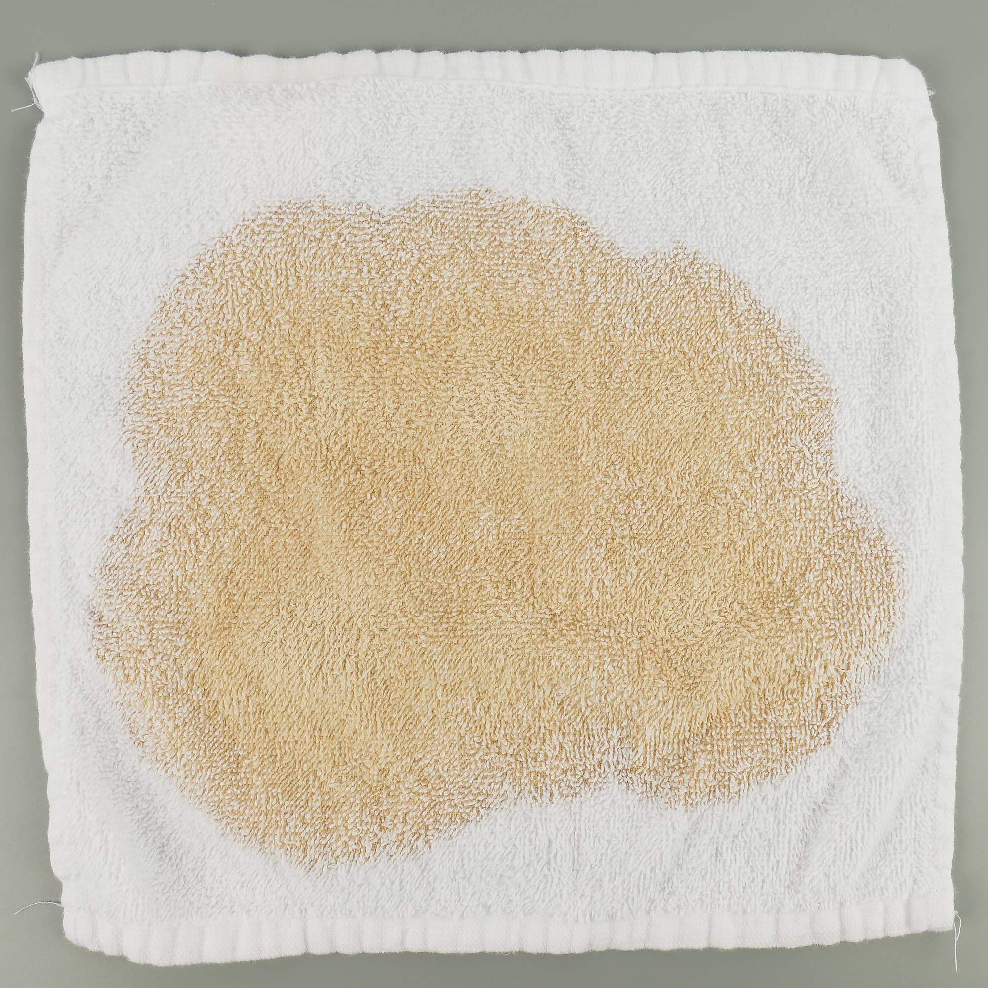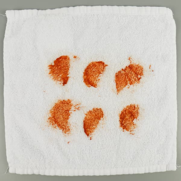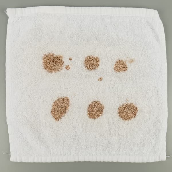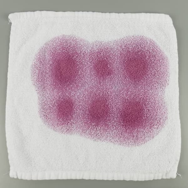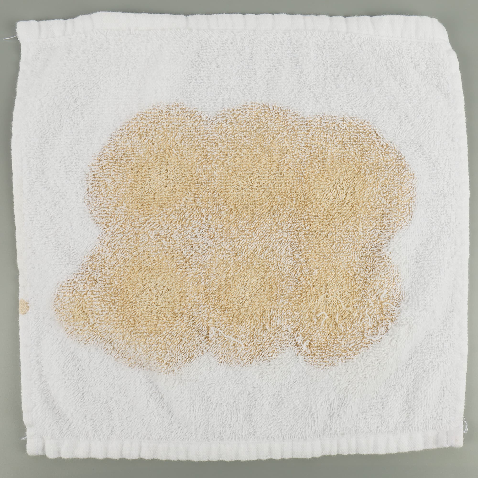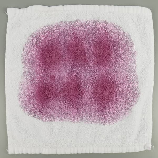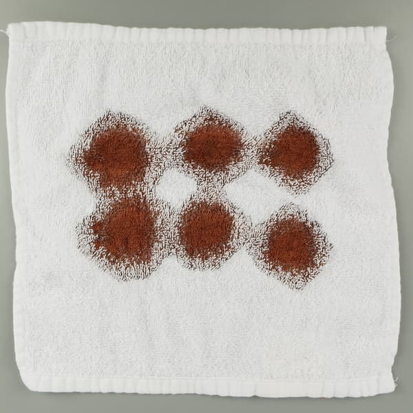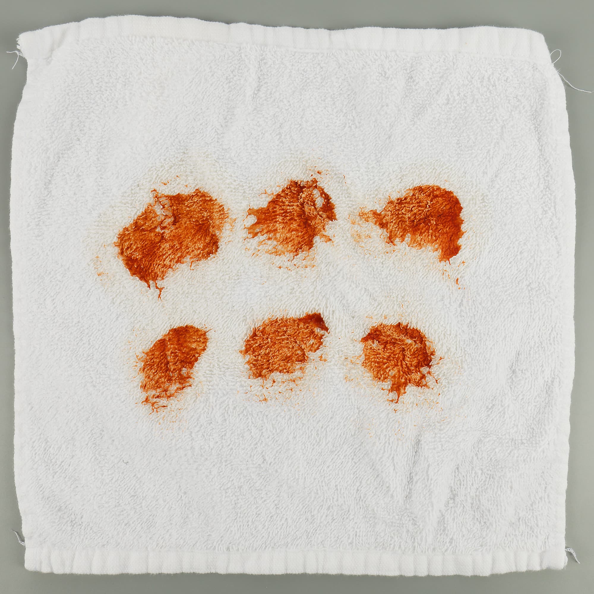 Взяв эти привычные нам жидкости, мы нанесли их на белые махровые салфетки — так, чтобы на каждой пятен было несколько, а грязь, их оставившая, — одна и та же. Эти живописные полотна положили сушиться на сутки при комнатной температуре, а уж потом закинули в стирку.
