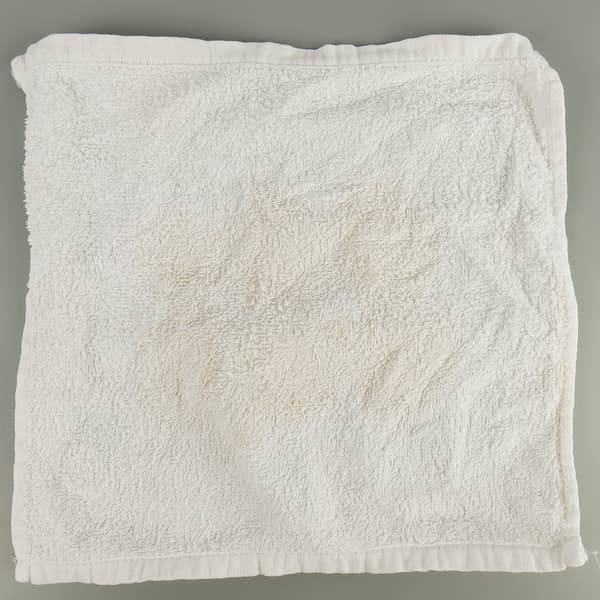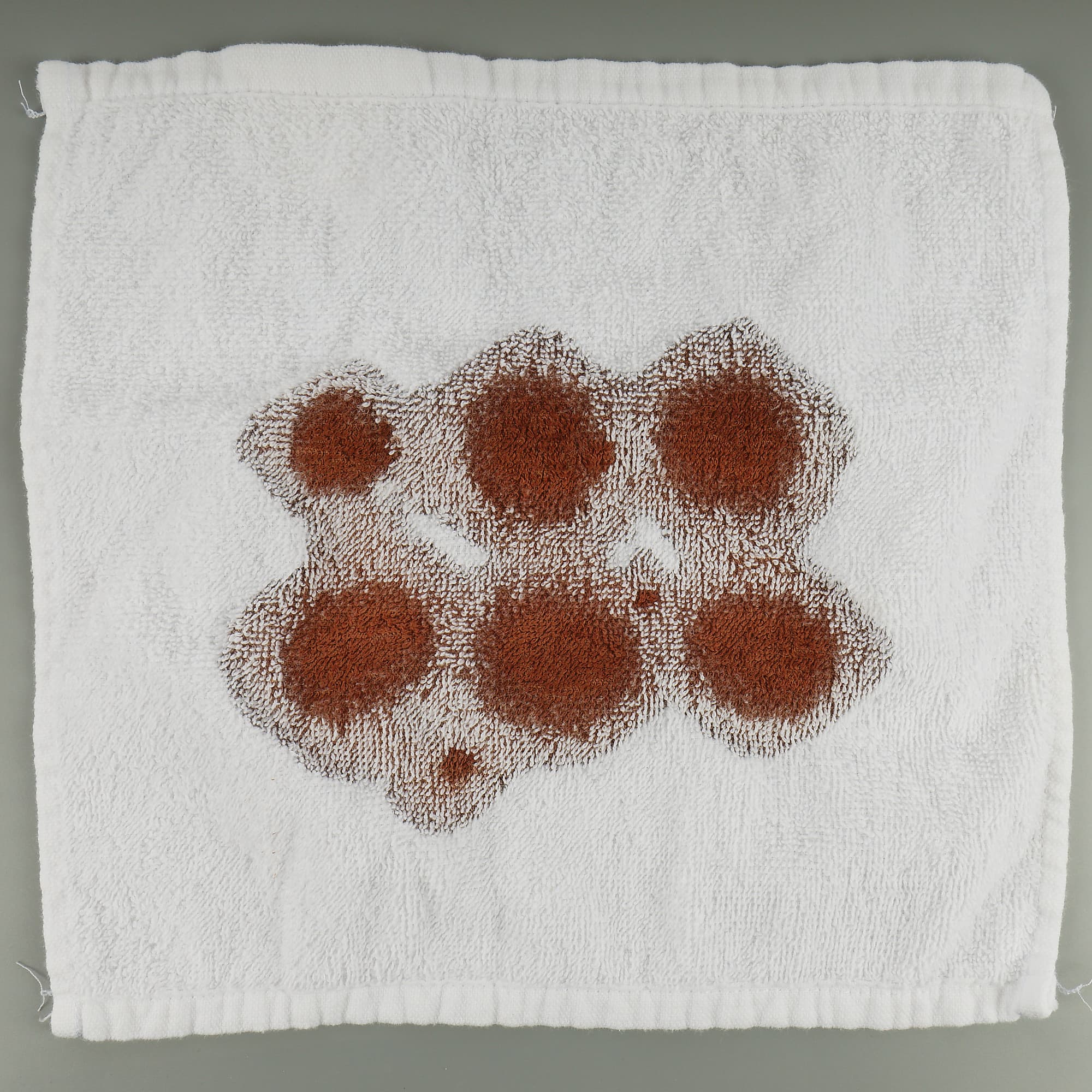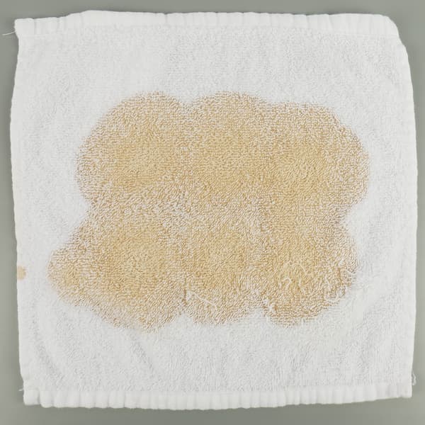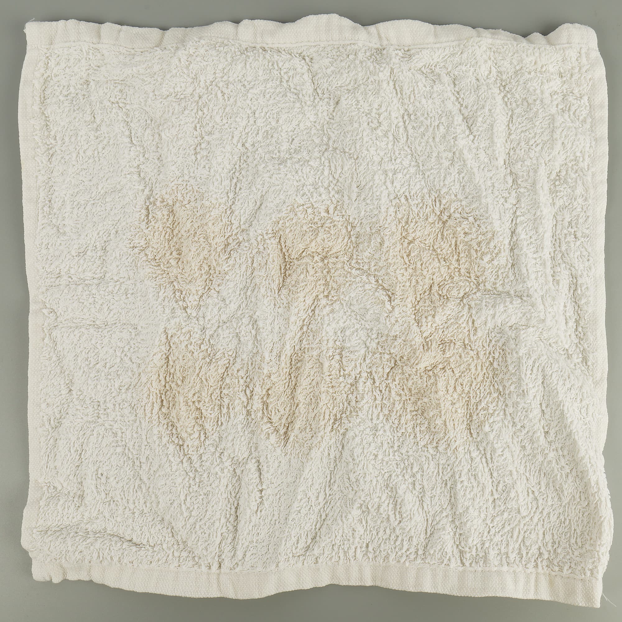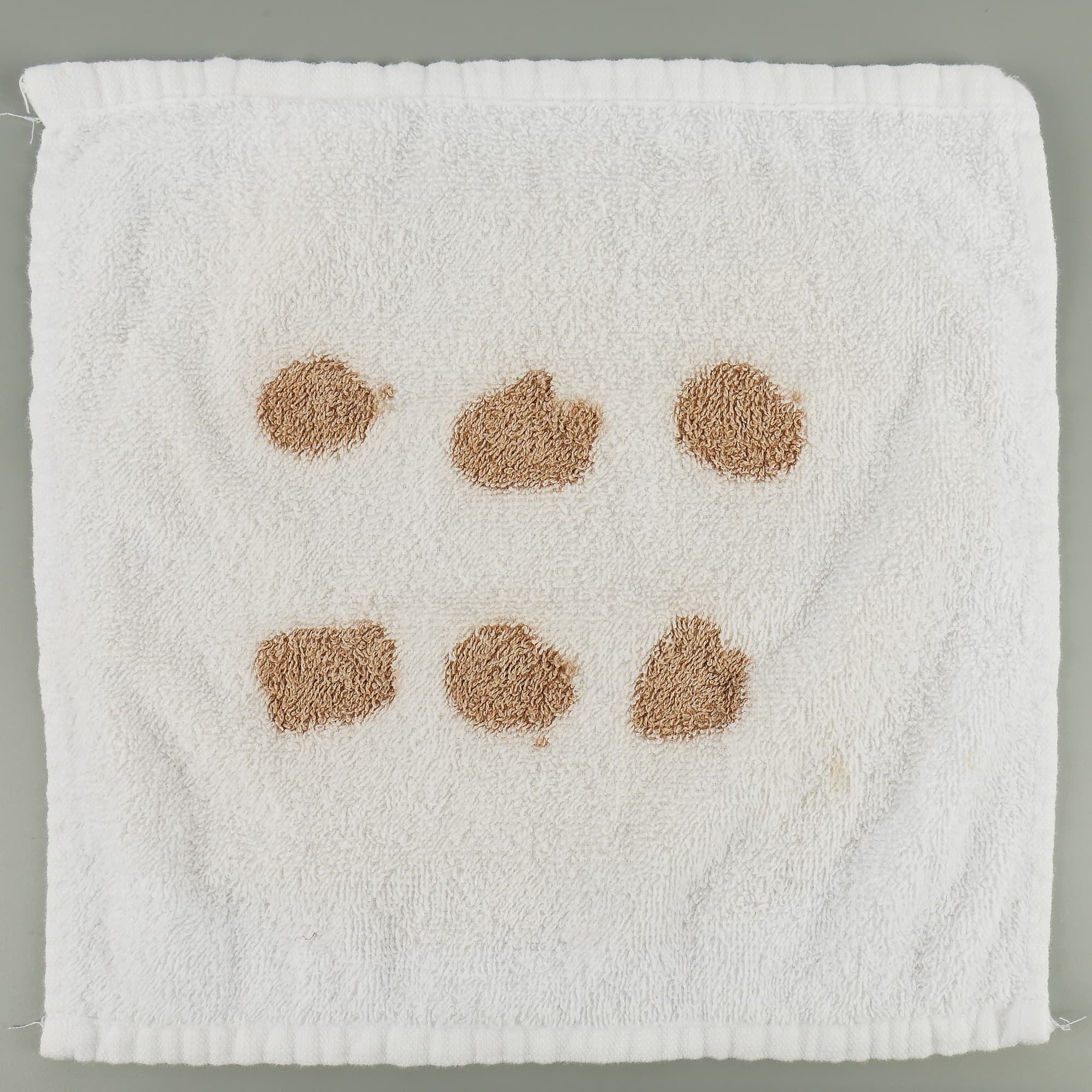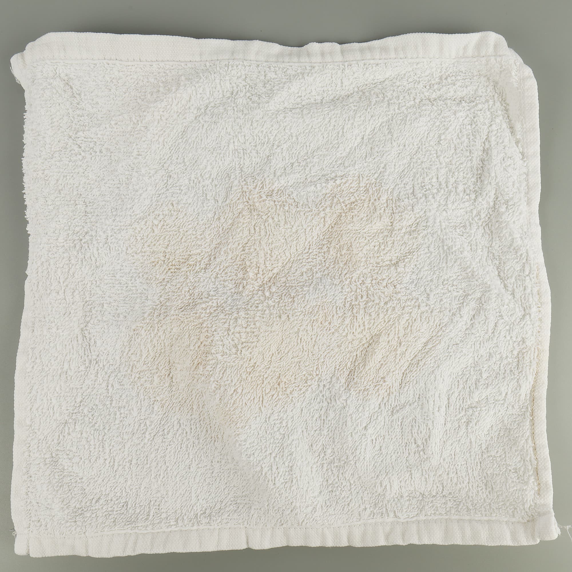 Взяв эти привычные нам жидкости, мы нанесли их на белые махровые салфетки — так, чтобы на каждой пятен было несколько, а грязь, их оставившая, — одна и та же. Эти живописные полотна положили сушиться на сутки при комнатной температуре, а уж потом закинули в стирку.
