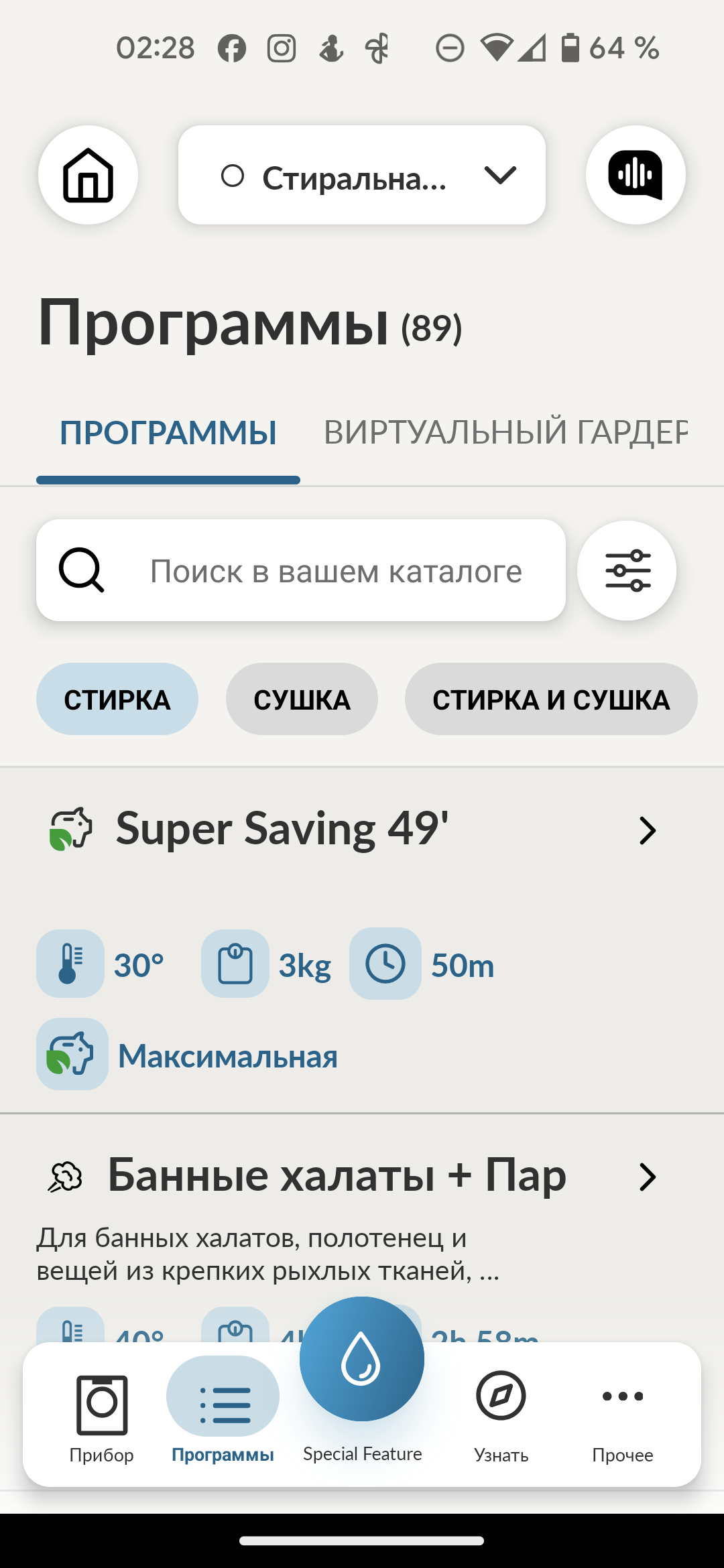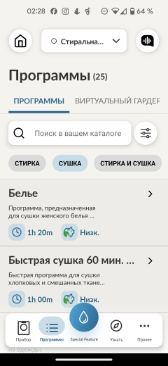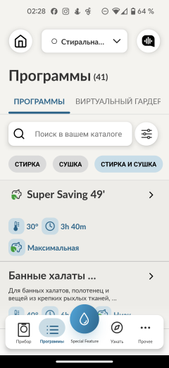 Помимо 89 программ стирки приложение предлагает 41 сценарий стирки с последующей сушкой и 25 разнообразных типов сушки. Предустановленные настройки логичны, и мы не нашли ни одного цикла с неподходящими режимами: температура, скорость отжима, рекомендованные вес белья и расход моющих средств выглядят вполне здраво.