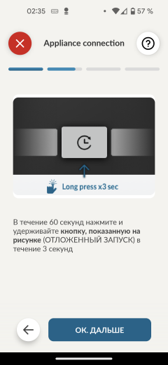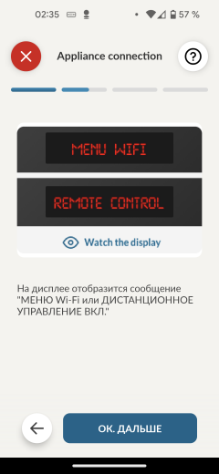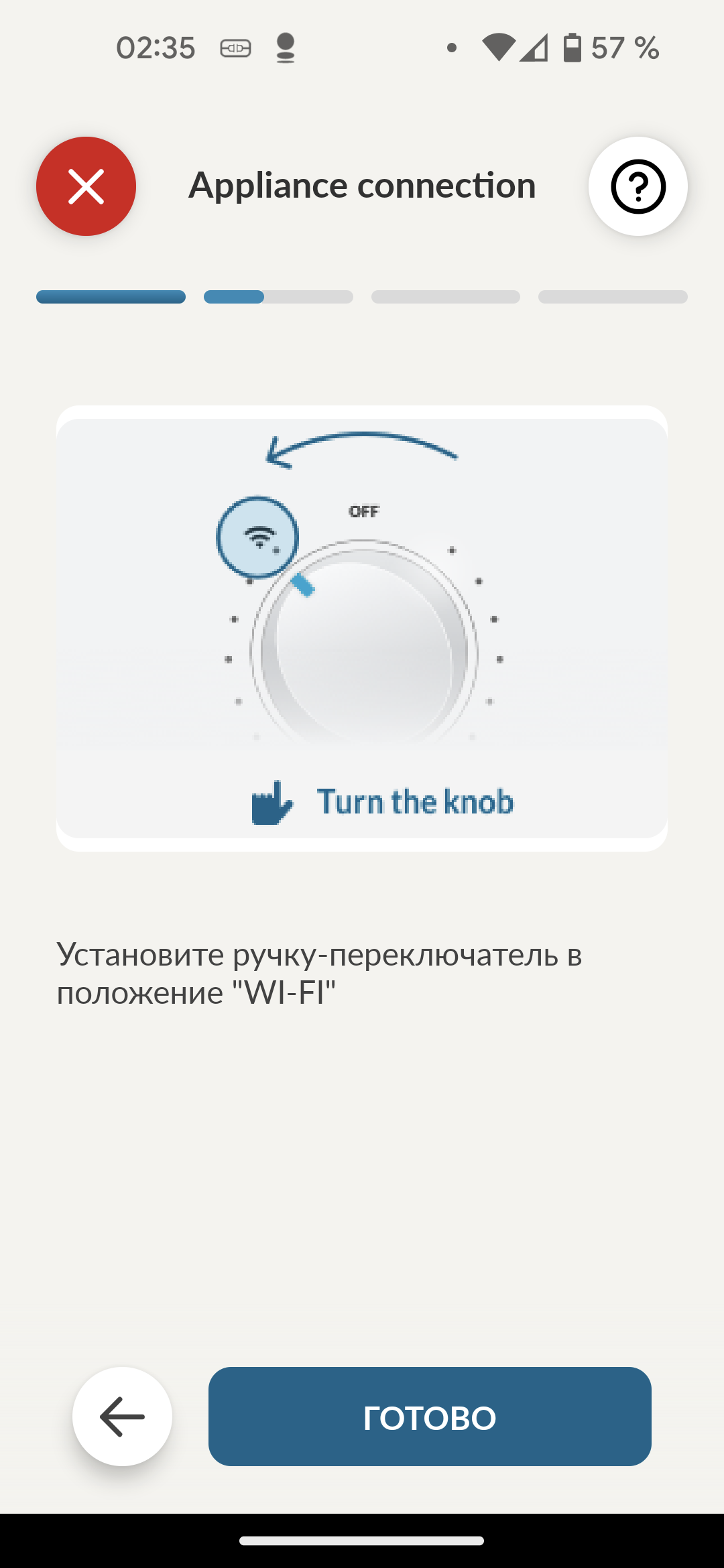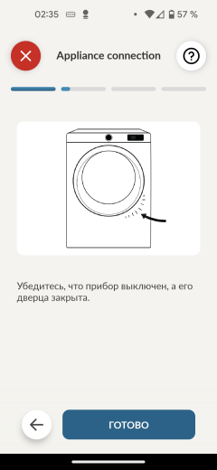 На следующем этапе приложение просит ввести пароль от беспроводной сети, в которой машине предстоит работать, и перевести селектор стиралки в положение «Wi-Fi».