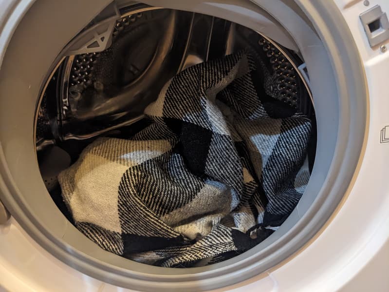 Чистота нужна не только хлопку, который выдержит максимальную температуру, но и более деликатным тканям. Для тестирования стандартной программы для шерсти мы взяли любимый и часто используемый плед весом чуть меньше килограмма.