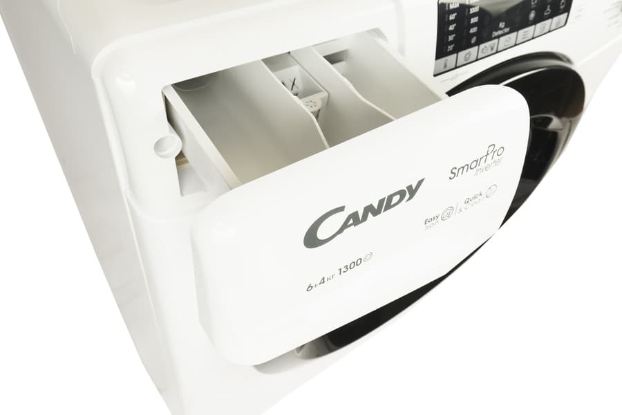 Стирально-сушильная машина Candy Smart Pro Inverter CSOW43646TWMB-07 отличается компактными размерами, позволяющими разместить ее в самом небольшом помещении, и большим набором программ: в нем традиционные сценарии удачно сочетаются с уникальными быстрыми, разработанными производителем. Даже на стандартных режимах машина показала неплохую экономичность и хорошее качество стирки.