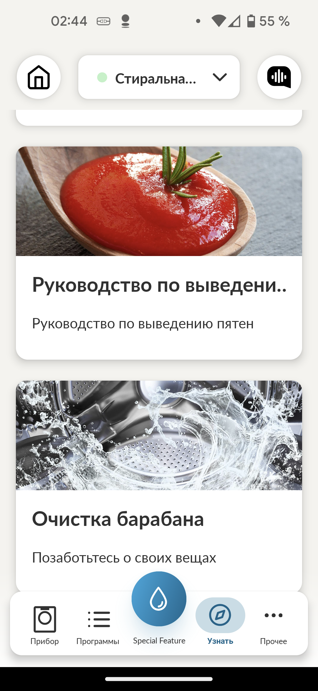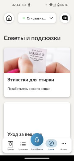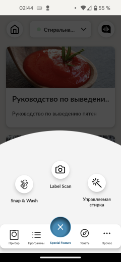 В справке можно найти рекомендации по использованию прибора, а также советы по удалению разнообразных пятен и краткие сведения о маркировке тканей. Раздел «Special Feature» предоставляет доступ к новым функциям с использованием искусственного интеллекта: «Label Scan» позволит разобраться в инструкциях на этикетке и подобрать наилучший режим стирки для каждого предмета. А сервис «Snap & Wash» предлагает сфотографировать одежду, брошенную кучей перед стиральной машиной, обещая распознать предметы и выбрать для них оптимальную программу.