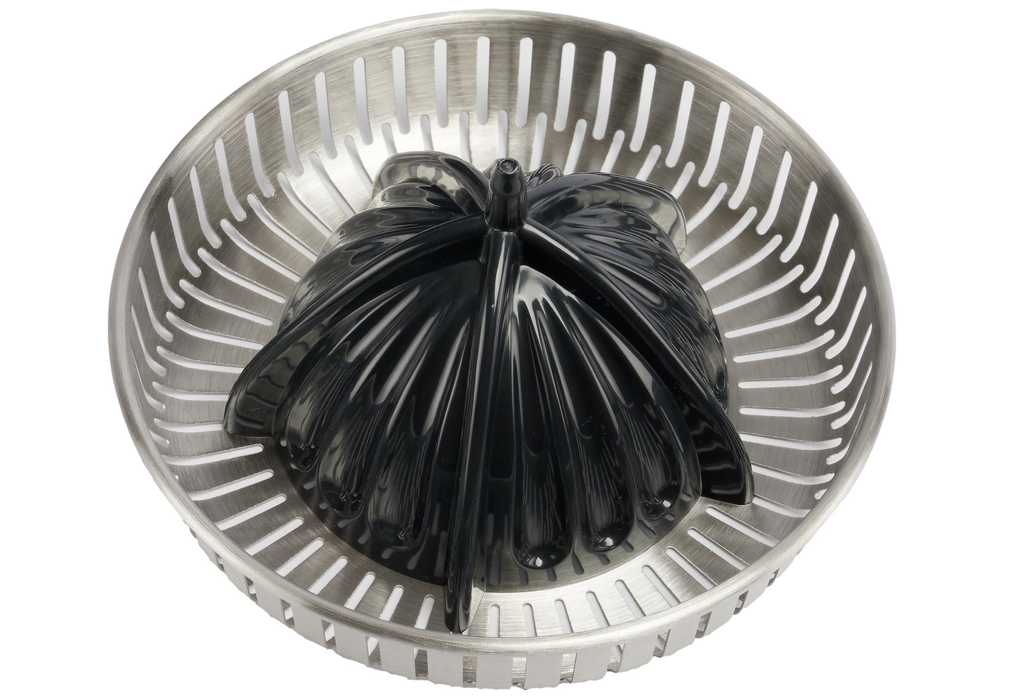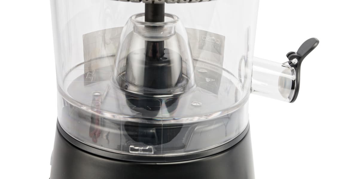 Конструкция и размер конуса подходит, как обещает производитель, для цитрусов любых размеров: от лайма до грейпфрута. На его вершине виден небольшой выступ, предназначенный для правильного позиционирования плода. Конус соединен с металлическим ситом, фильтрующим сок от мякоти и косточек.