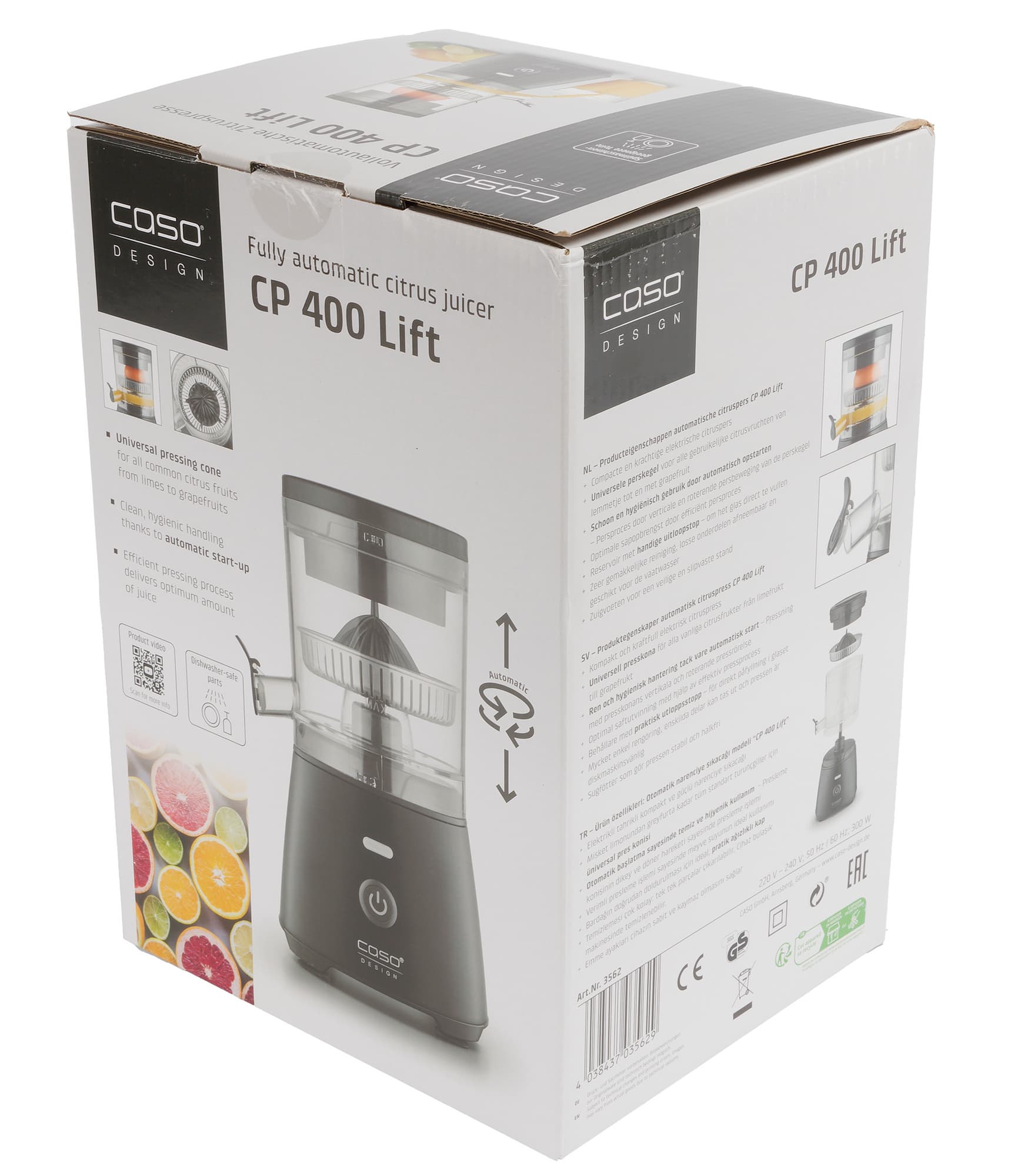 Соковыжималка Caso CP 400 Lift упакована в цветную картонную коробку, украшенную множеством фотографий устройства в действии.