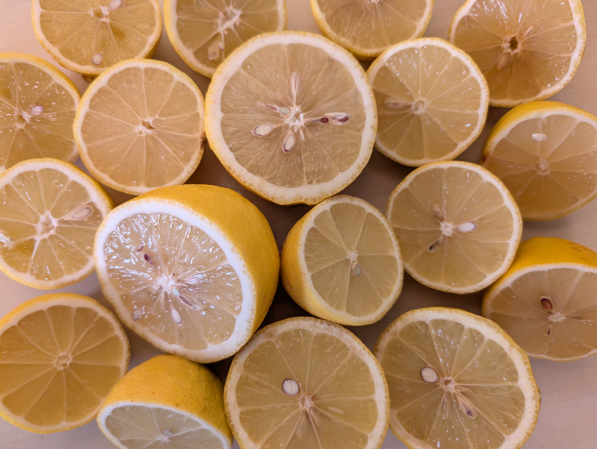 В нашем распоряжении были два сорта плодов в равной пропорции: мелкие, с тонкой кожурой, и сравнительно крупные, с толстой и мясистой шкурой. Оба сорта лимонов оказались с большим количеством мелких косточек. Вес исходного продукта — 1020 граммов.