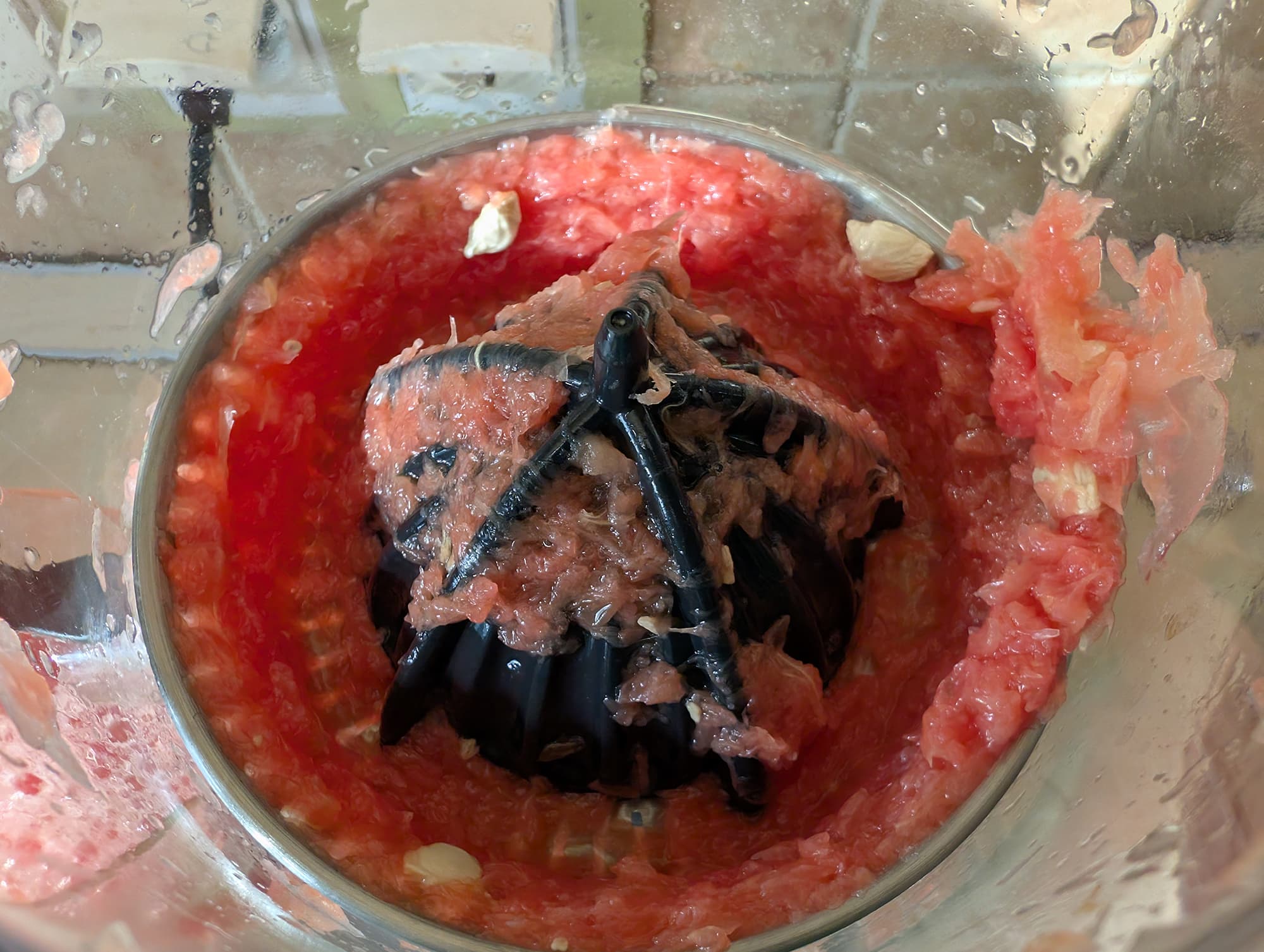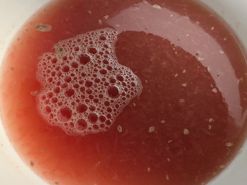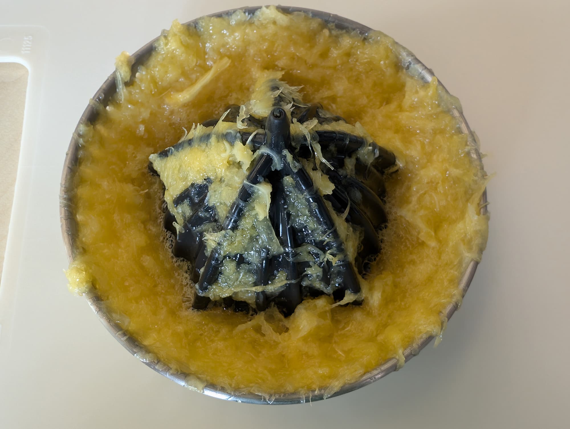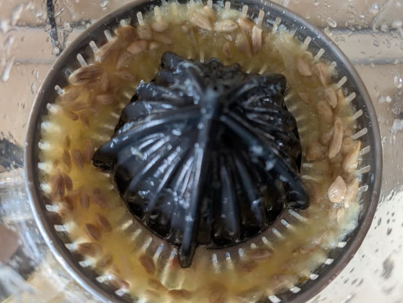 Готовый сок содержал заметное количество фрагментов раздробленных семян и мякоти. Результат показался нам не вполне удовлетворительным, поэтому мы дополнительно профильтровали жидкость через металлическое сито, получив еще 28 граммов твердой фракции.
