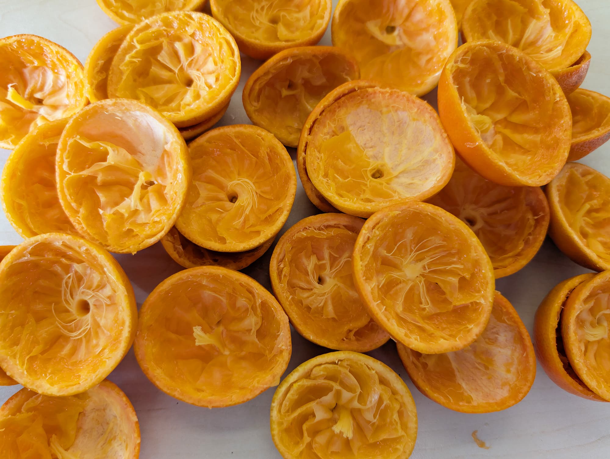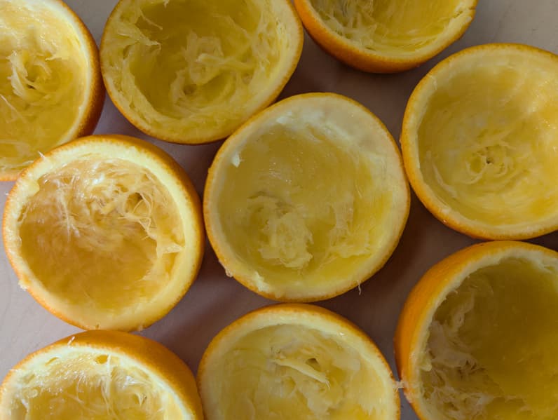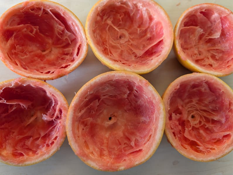 На шесть циклов отжима ушла 1 минута и 54 секунды. Бо́льшая часть пленок осталась внутри шкурок, а мякоть вместе с соком была удалена из них вполне качественно. Вес половинок после отжима составил 434 грамма.