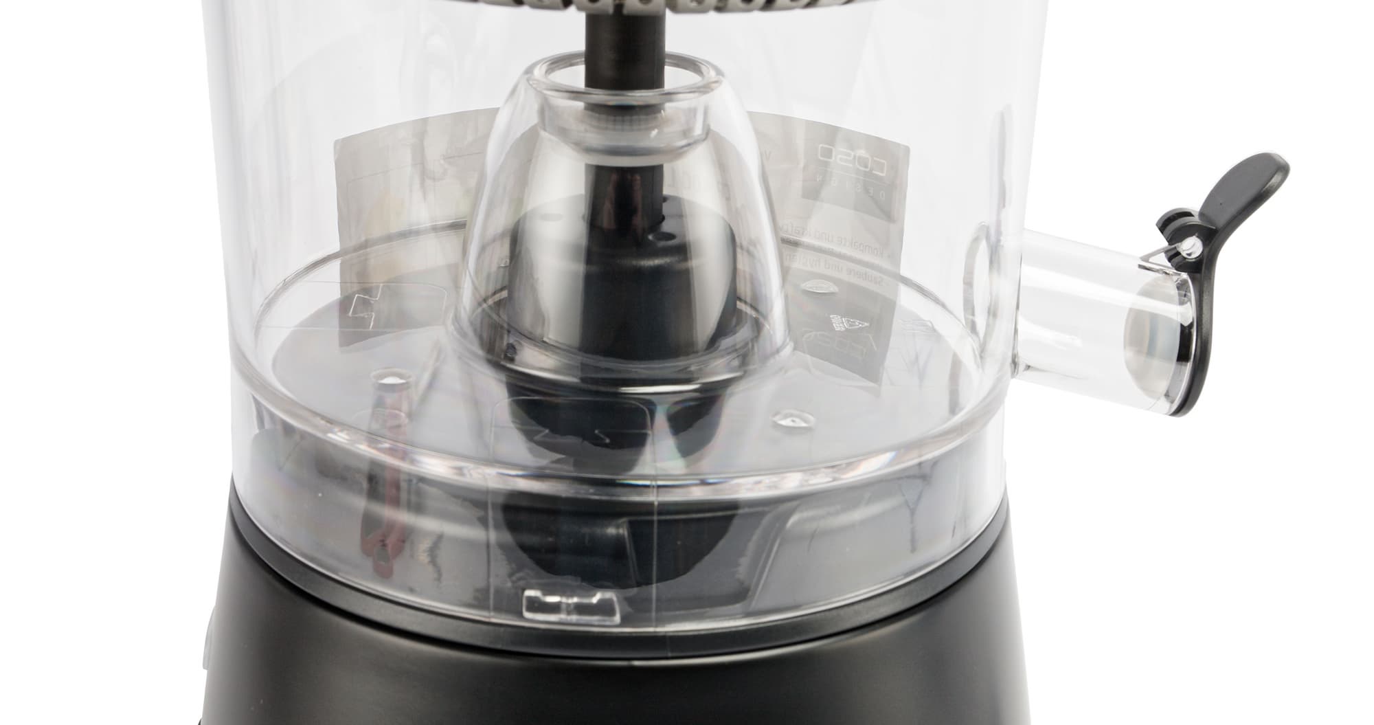 Производитель украсил резервуар бумажной наклейкой с краткой инструкцией на немецком языке. Снять ее без следов с первого раза нам не удалось: для этого потребовалось вымыть конструкцию в посудомоечной машине. К счастью, все компоненты устройства (за исключением, конечно, моторного блока) допускают машинную мойку.