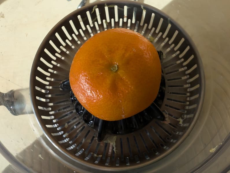 Половинку фрукта устанавливают на конус срезанной стороной вниз и слегка надавить, чтобы зафиксировать его. Под носик можно подставить подходящую емкость — стакан или графин, либо оставить сливной клапан закрытым, если хочется смешать в емкости соки разных сортов цитрусов.