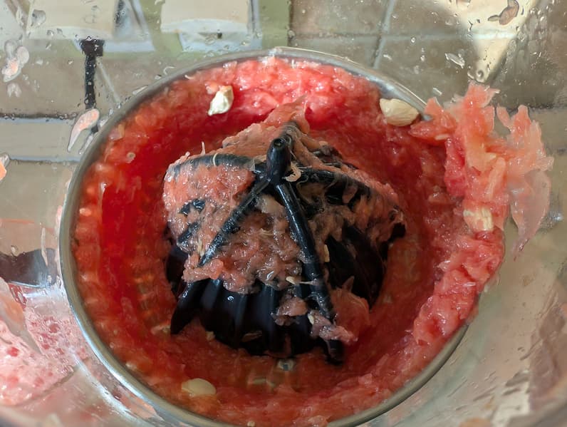 Три плода с красной мякотью и общим весом 1112 граммов были разрезаны на половинки и отправлены в соковыжималку.