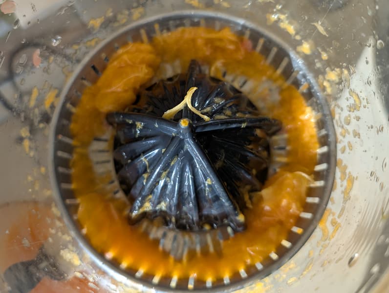 Выход сока составил 504 грамма, или 47% — это очень хороший результат. Вес отжатых корок оказался равен 440 граммам. Оставшиеся 121 грамм — вес мякоти на решетке и внутри кувшина.