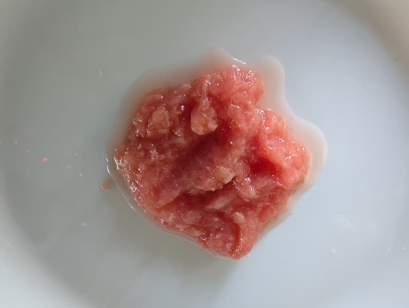 Все косточки вместе с мякотью остались на сетке, которая отлично отфильтровала твердые фракции. Вес мякоти — всего 60 граммов.