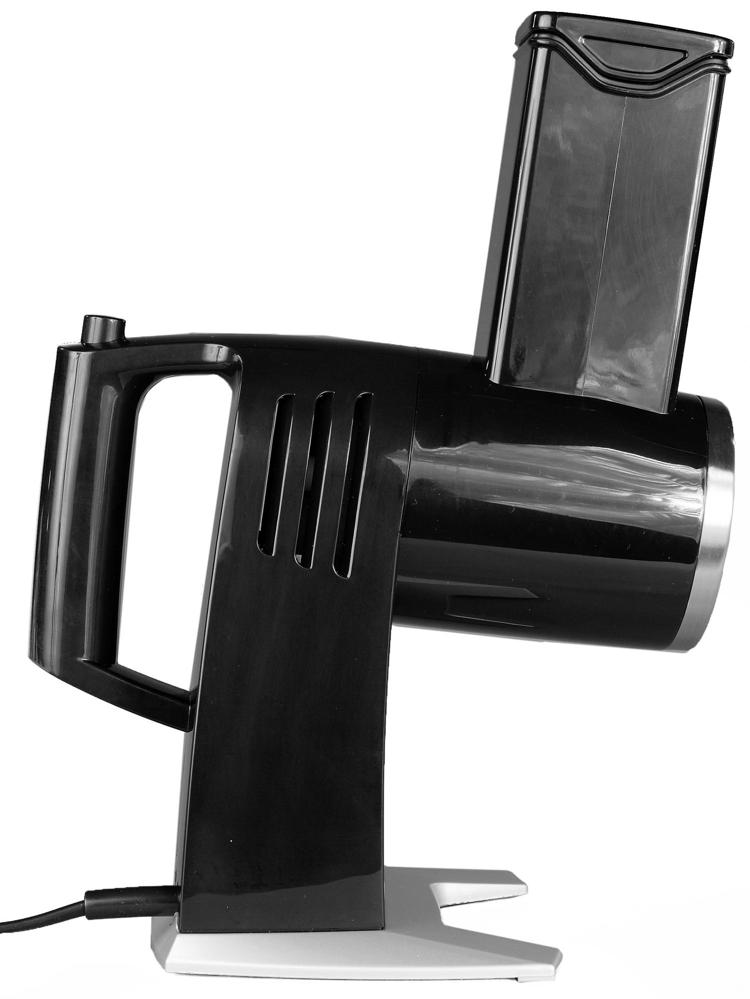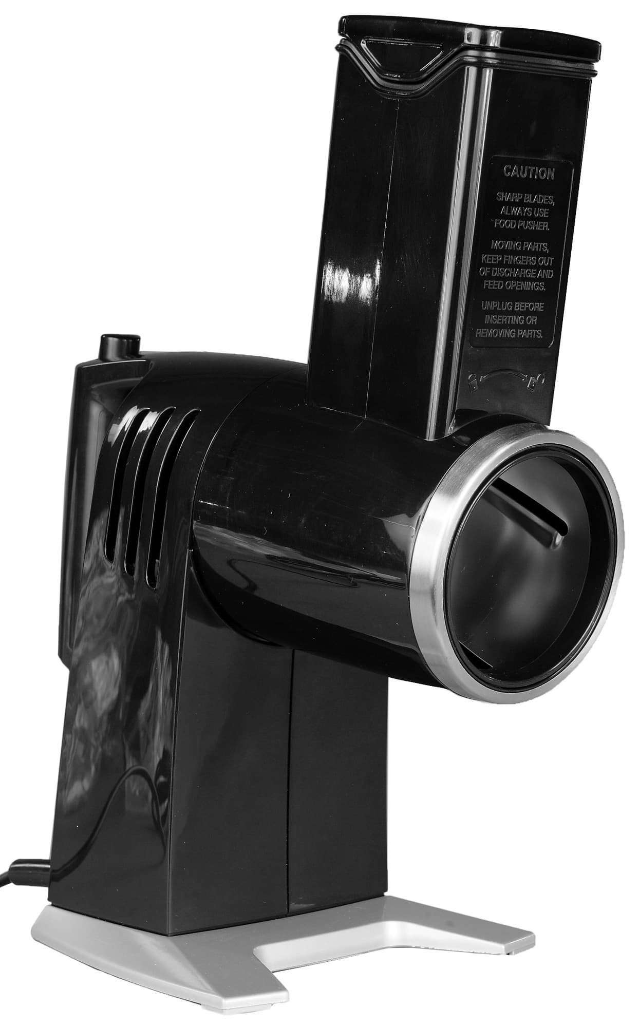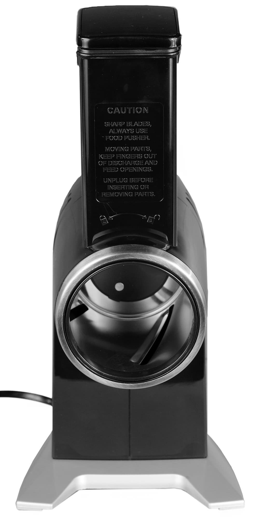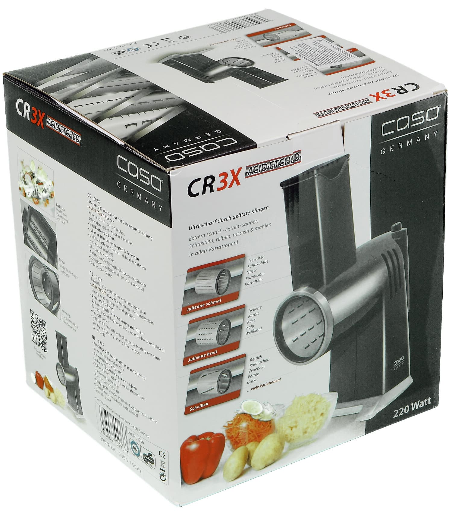 Отличительной особенностью Caso CR3X Acid Etched является слегка наклоненный раструб, из которого осуществляется подача измельченных продуктов. Таким образом натертые фрукты или овощи будут буквально сами попадать в подставленную тарелку или другую емкость. Высота такой емкости должна составлять не более 9,5 см, чего должно быть более чем достаточно.