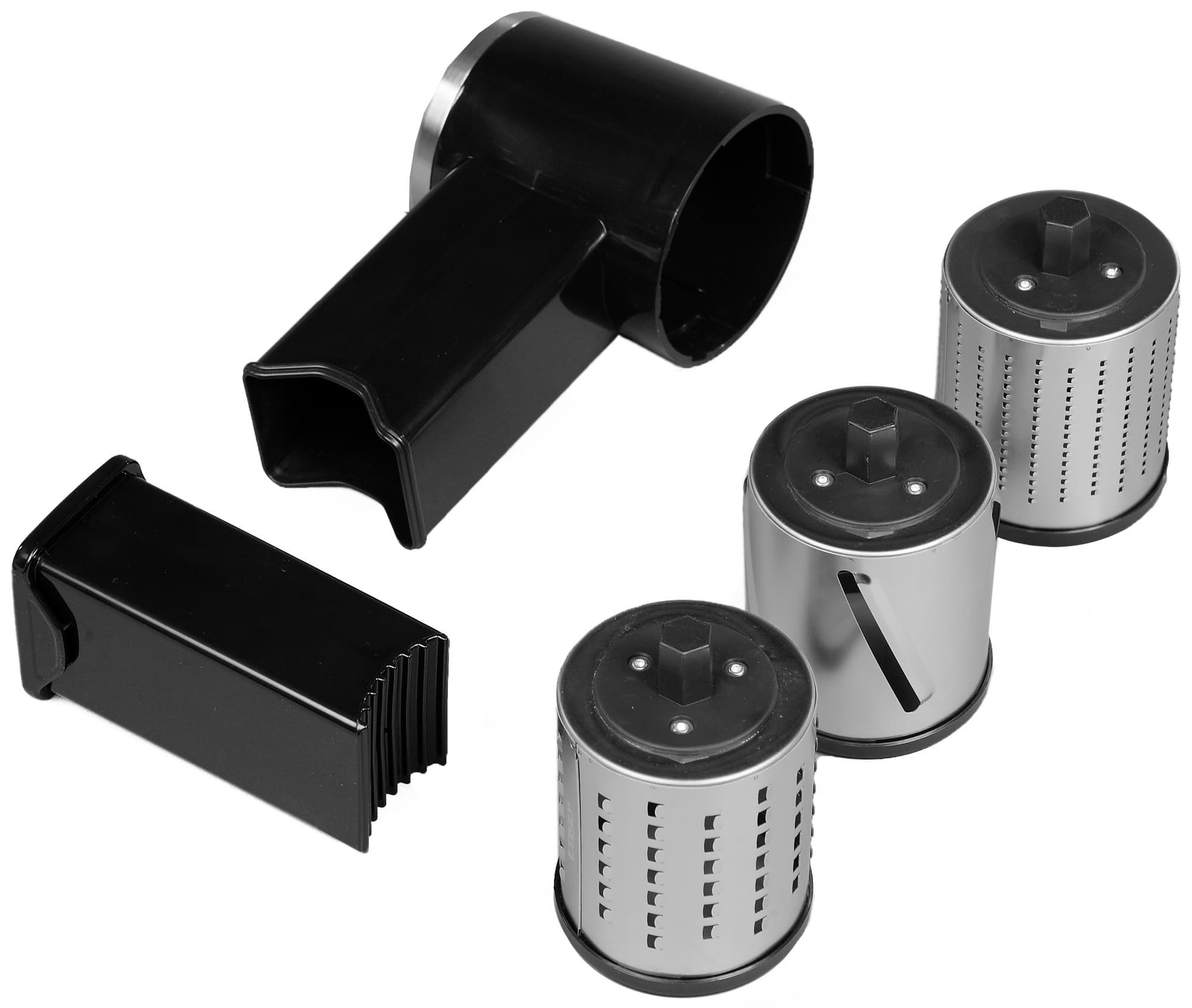 Насадки для нарезки представляют собой барабаны диаметром 75 мм, сделанные из того самого «особо прочного металла, травленого кислотой». Измельчение продукта происходит с помощью острых «лепестков», выступающих над поверхностью барабана. Обращаться с такими насадками нужно осторожно: в случае падения лепестки могут погнуться.