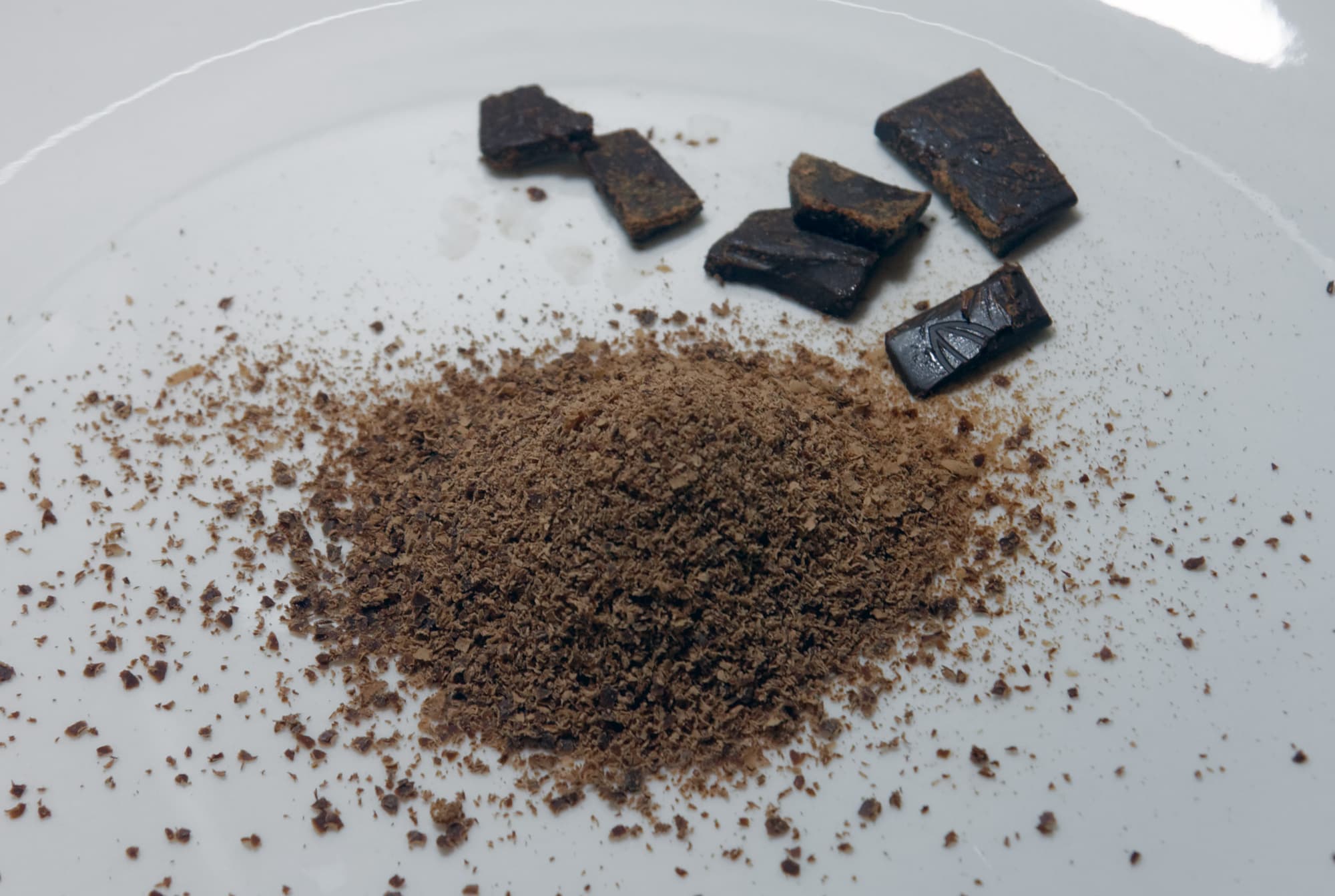 Измельчение шоколада с помощью ручной терки может стать довольно неприятной задачей. Во-первых, шоколад так и норовит сломаться. Во-вторых, он быстро начинает таять в руках. Электрическая терка позволяет решить обе эти проблемы. Мы взяли плитку шоколада, слегка заморозили ее в морозилке, после чего натерли на самой мелкой терке.