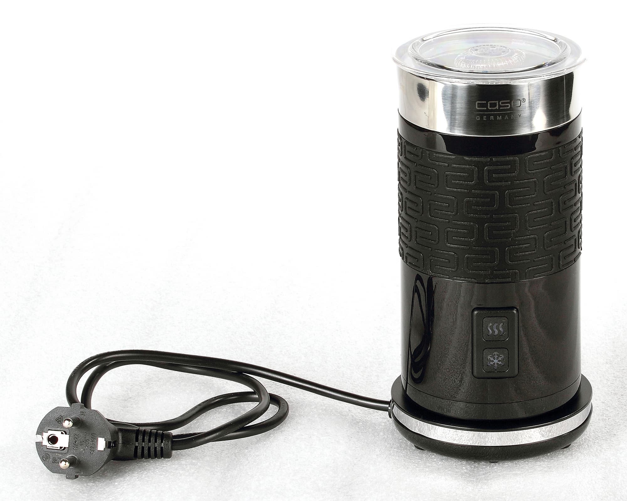 В наших обзорах различных приборов для приготовления кофе мы неоднократно упоминали капучинаторы. И вот теперь в нашей лаборатории оказался прибор, который делает молочную пену. Пеновзбиватель Caso представляет собой стакан с венчиками и крышкой, установленный на базу. Прибор умеет подогревать молоко, делать холодную и горячую молочную пену.