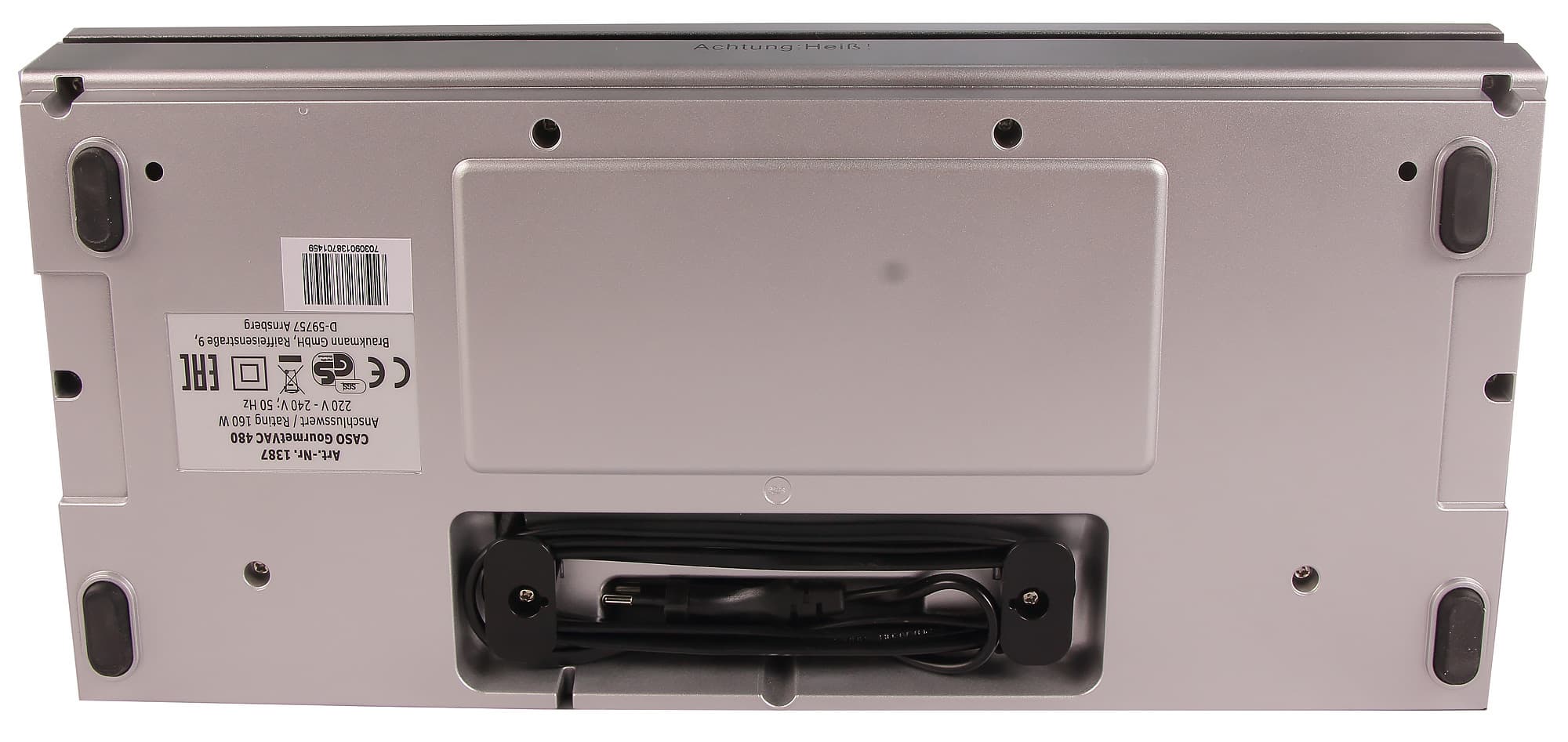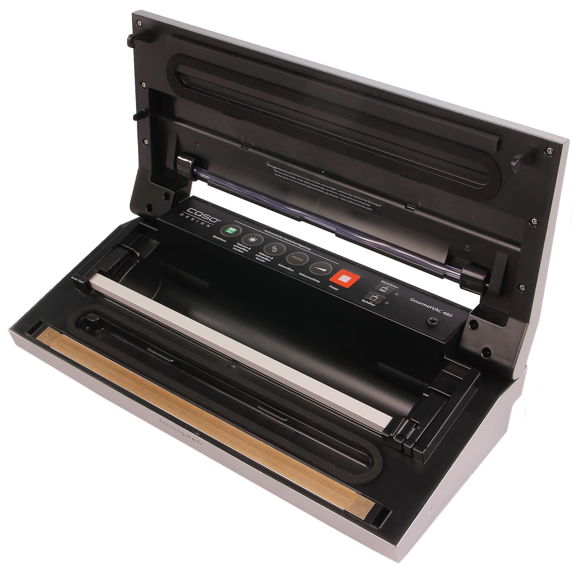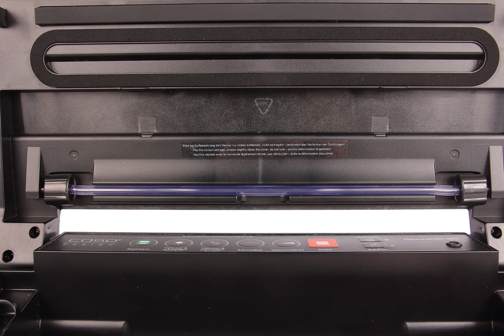 И, наконец, обращает на себя внимание отсутствие привычных боковых кнопок-защелок, с помощью которых фиксируется внешняя крышка. У нашего Caso GourmetVac 480 крышка блокируется автоматически при запуске режима вакуумации. Для этого используются специальные крючки, которые можно увидеть справа и слева под крышкой.