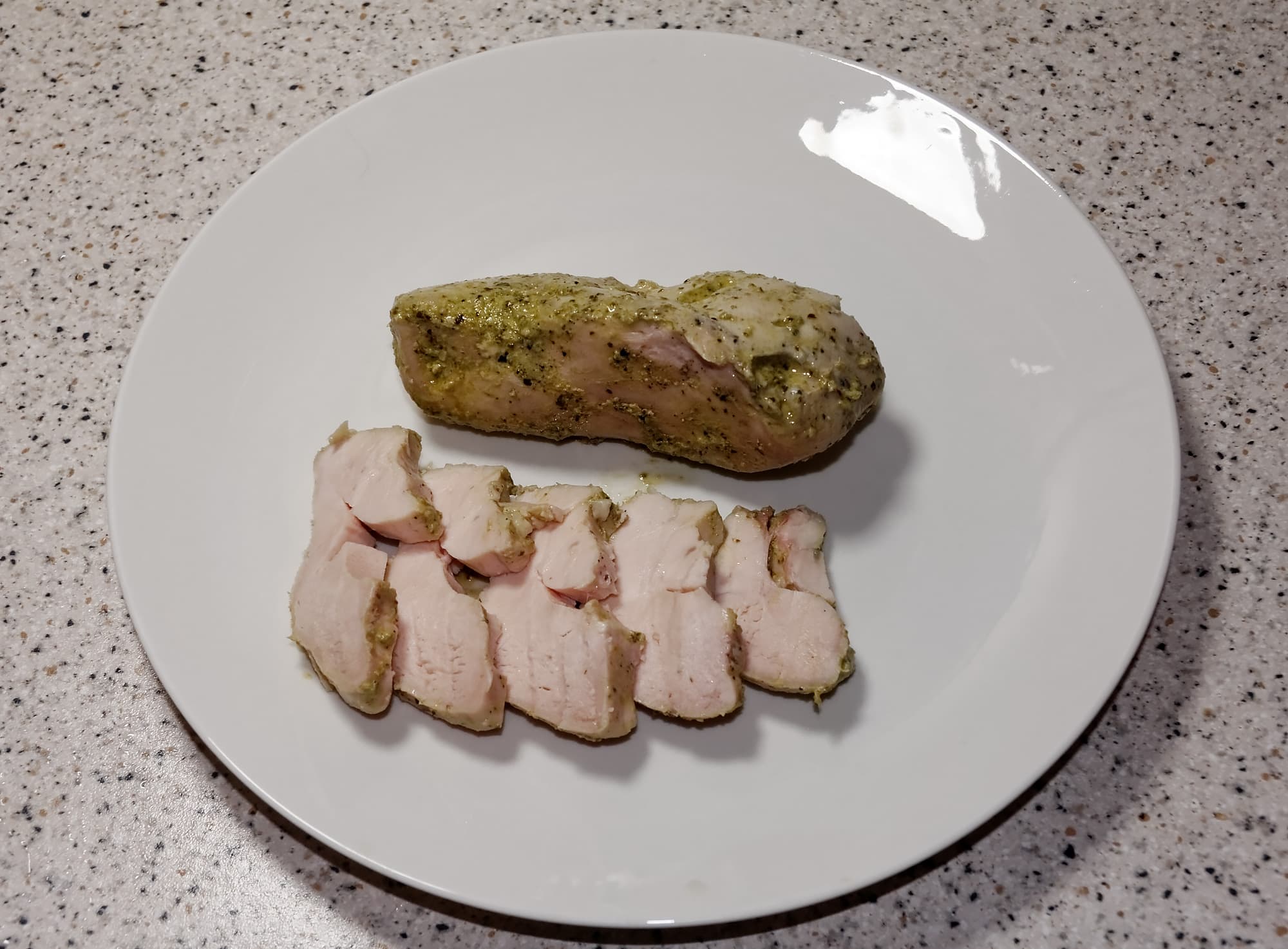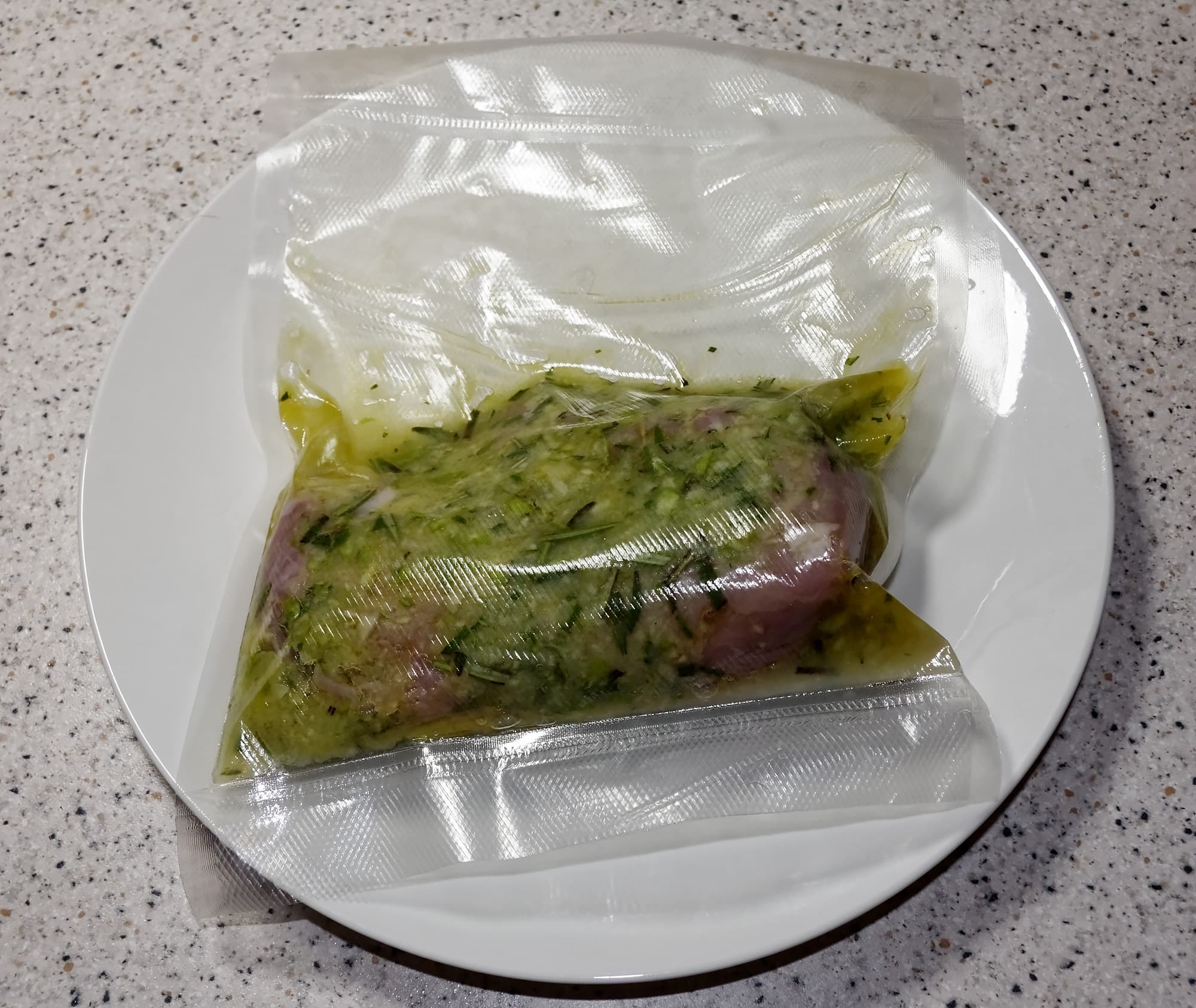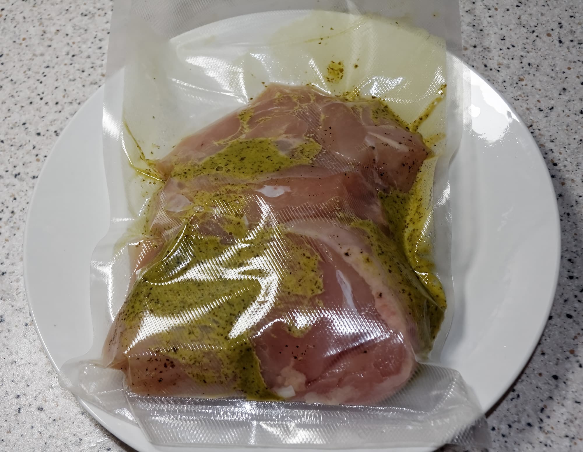 Для этого теста мы взяли филе куриной грудки, посолили его, обильно смазали соусом песто и вакуумировали.