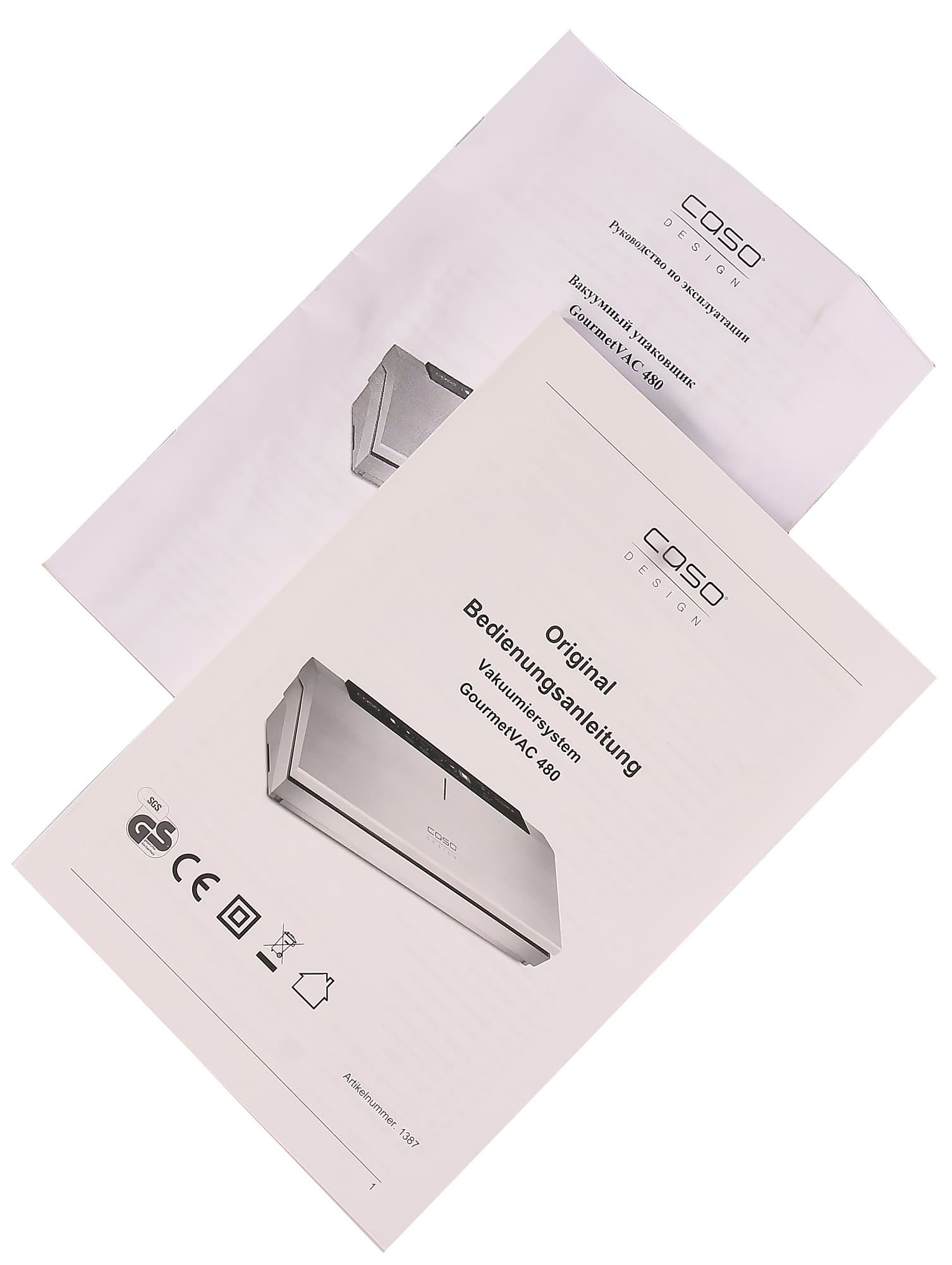 Оригинальная инструкция к вакууматору представляет собой 130-страничную черно-белую брошюру формата А5, отпечатанную на качественной бумаге. На долю каждого из языков (в т. ч. английского) приходится примерно по 18 страниц. Содержание инструкции стандартное: правила безопасности, первоначальная установка прибора, панель управления и дисплей, выбор режимов, очистка и уход за прибором и т. п.
