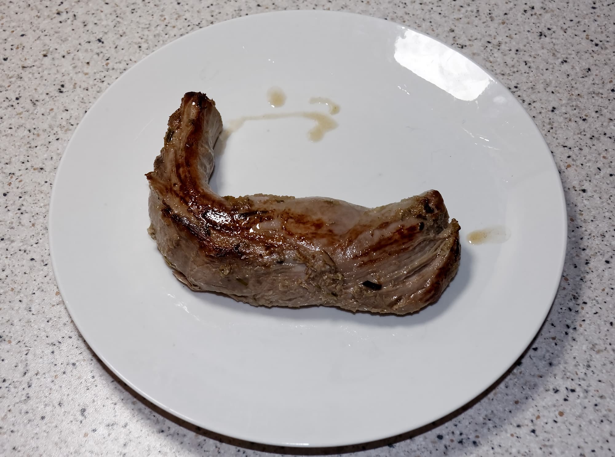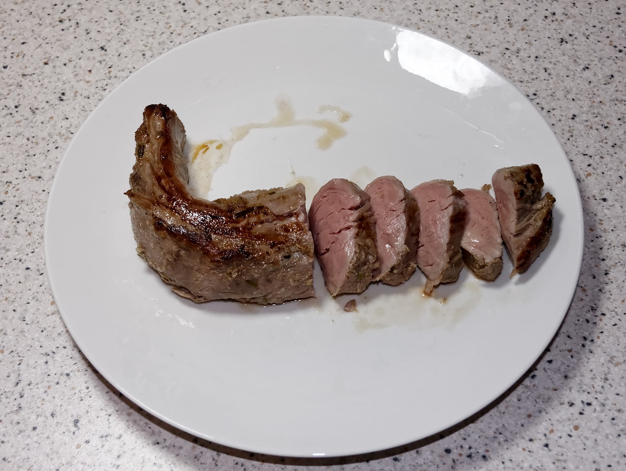 Мы взяли свежую свиную вырезку, вакуумировали ее с зеленью, чесноком, измельченным яблоком, луком и специями, продержали ночь в холодильнике и приготовили в су-виде на температуре 57 °C в течение 2,5 часов.