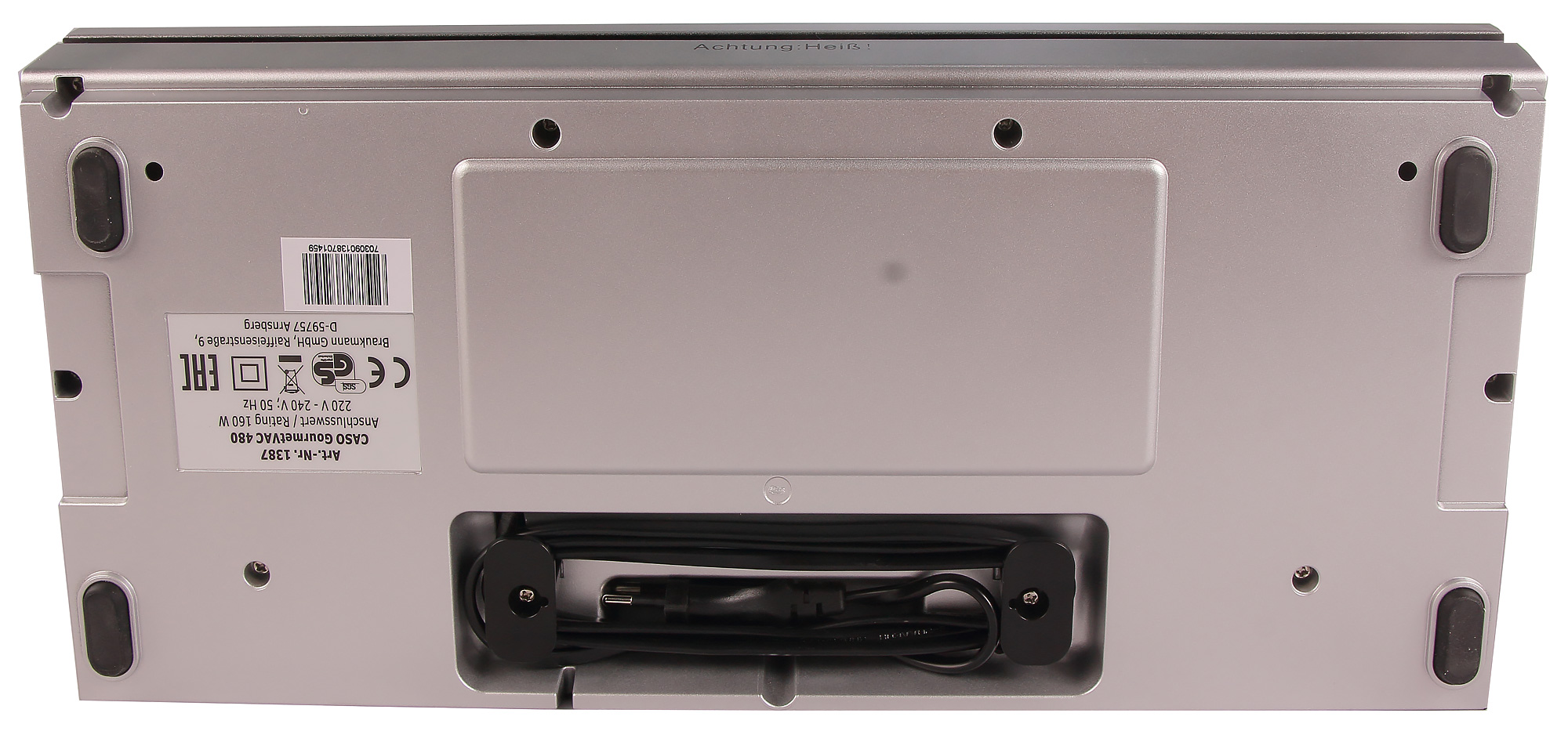 Снизу можно увидеть мягкие противоскользящие ножки и отсек для хранения шнура, в который могут спрятаться на только излишки провода, но и вилка. Прямо в отсеке, на задней стенке прибора, предусмотрена выемка для провода. Таким образом, пользователь может отрегулировать длину шнура так, что снаружи прибора будет находиться ровно столько, сколько достаточно для того, чтобы дотянуться до розетки.