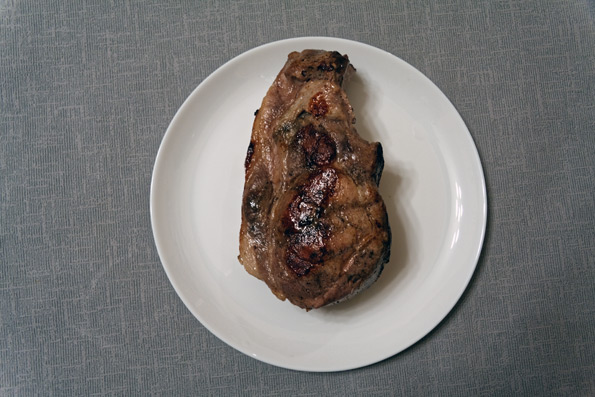 Кусок корейки размером в 2-3 ребра мы приправили солью и перцем и упаковали в вакуумный пакет и готовили на температуре 60 градусов 4 часа. По завершении процесса приготовления обжарили мясо на обычной сковороде на сливочном масле до появления небольшой корочки.